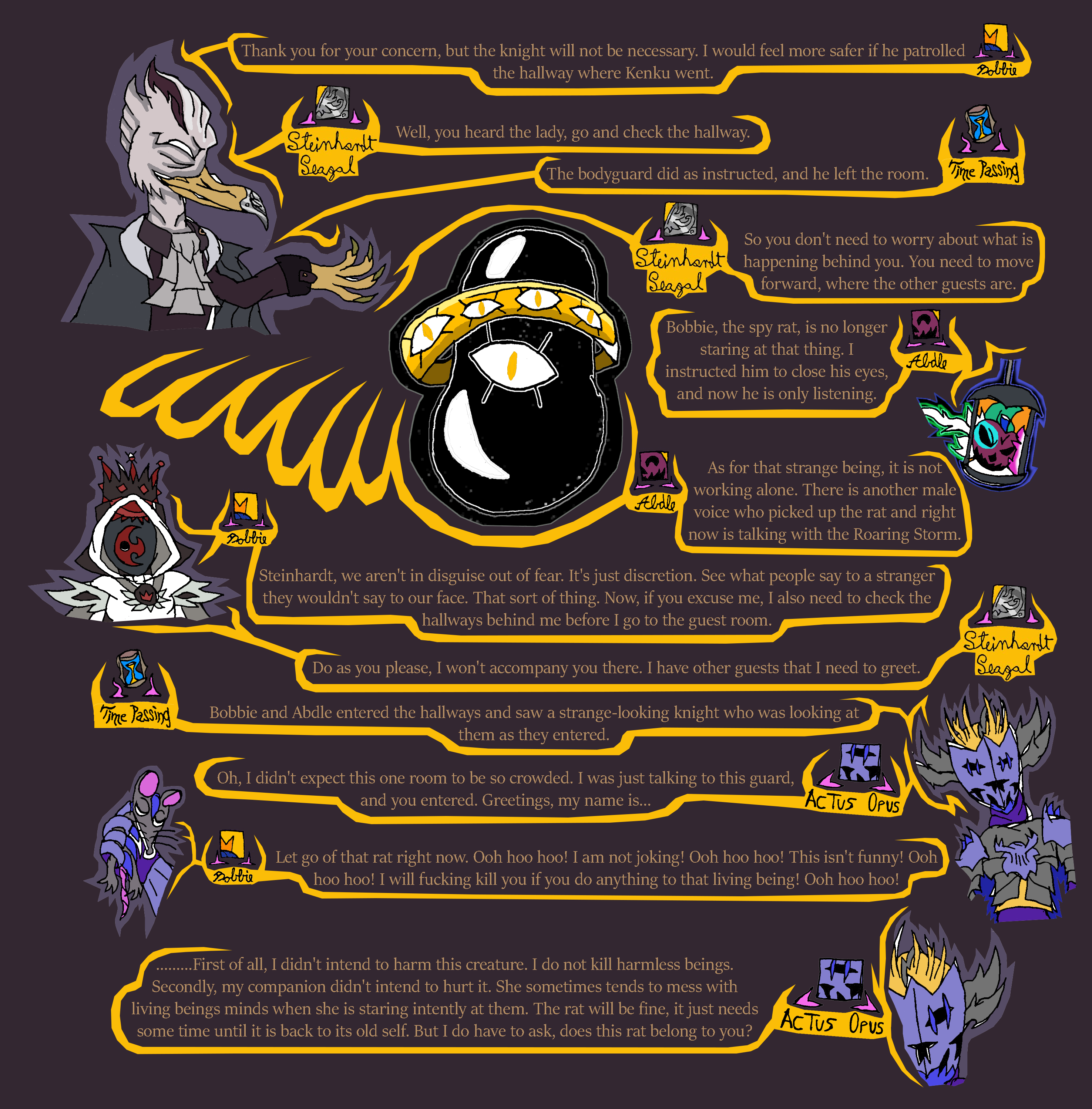 >"Not directly," the conundary says, while slurping on that embroidered section like a popsicle.