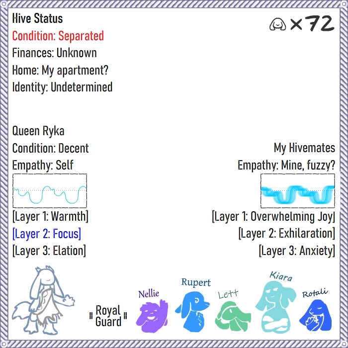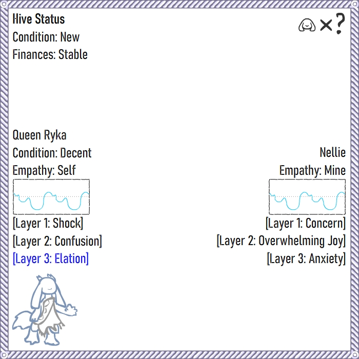 This story is about a neumono that spontaneously becomes a Queen, and their journey with the trials and tribulations of creating and supporting their own Hive. Given the nature of being a neumono monarch, sex may figure in somewhere. Full update pictures will likely be rare.