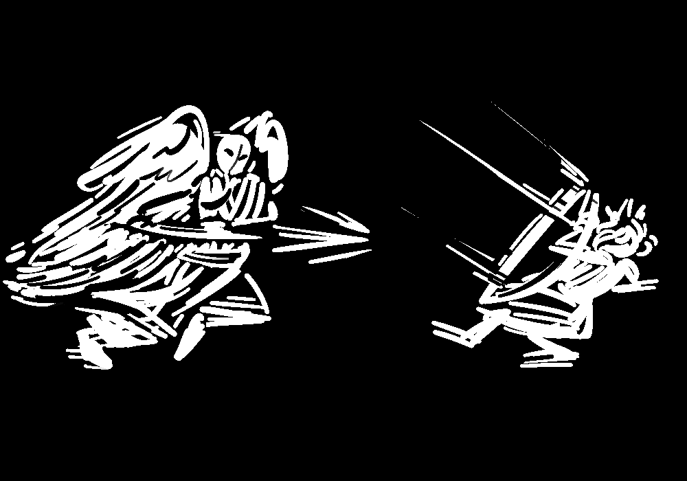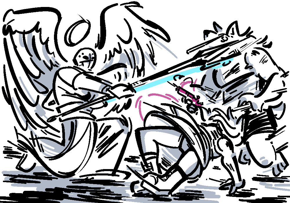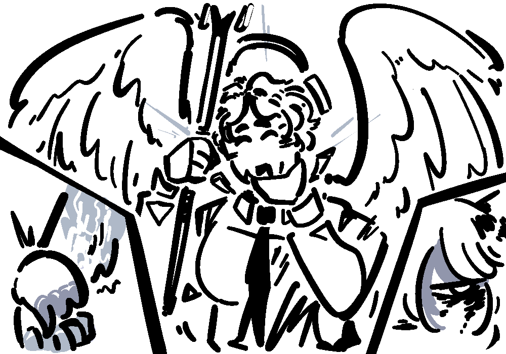 The force behind the spear starts to weaken. Deeper shadows envelop the angel as their body is torn apart. Their once bright wings rise high as a flag in the sky.