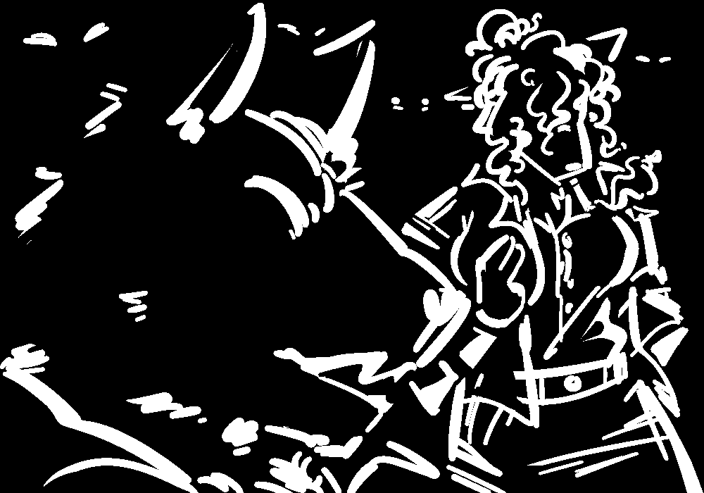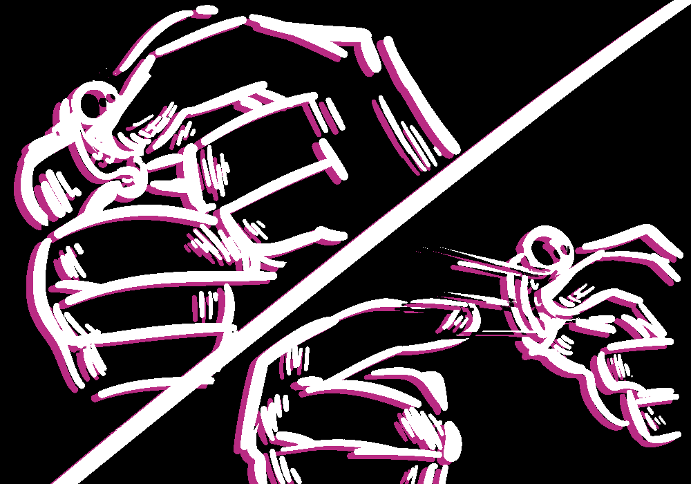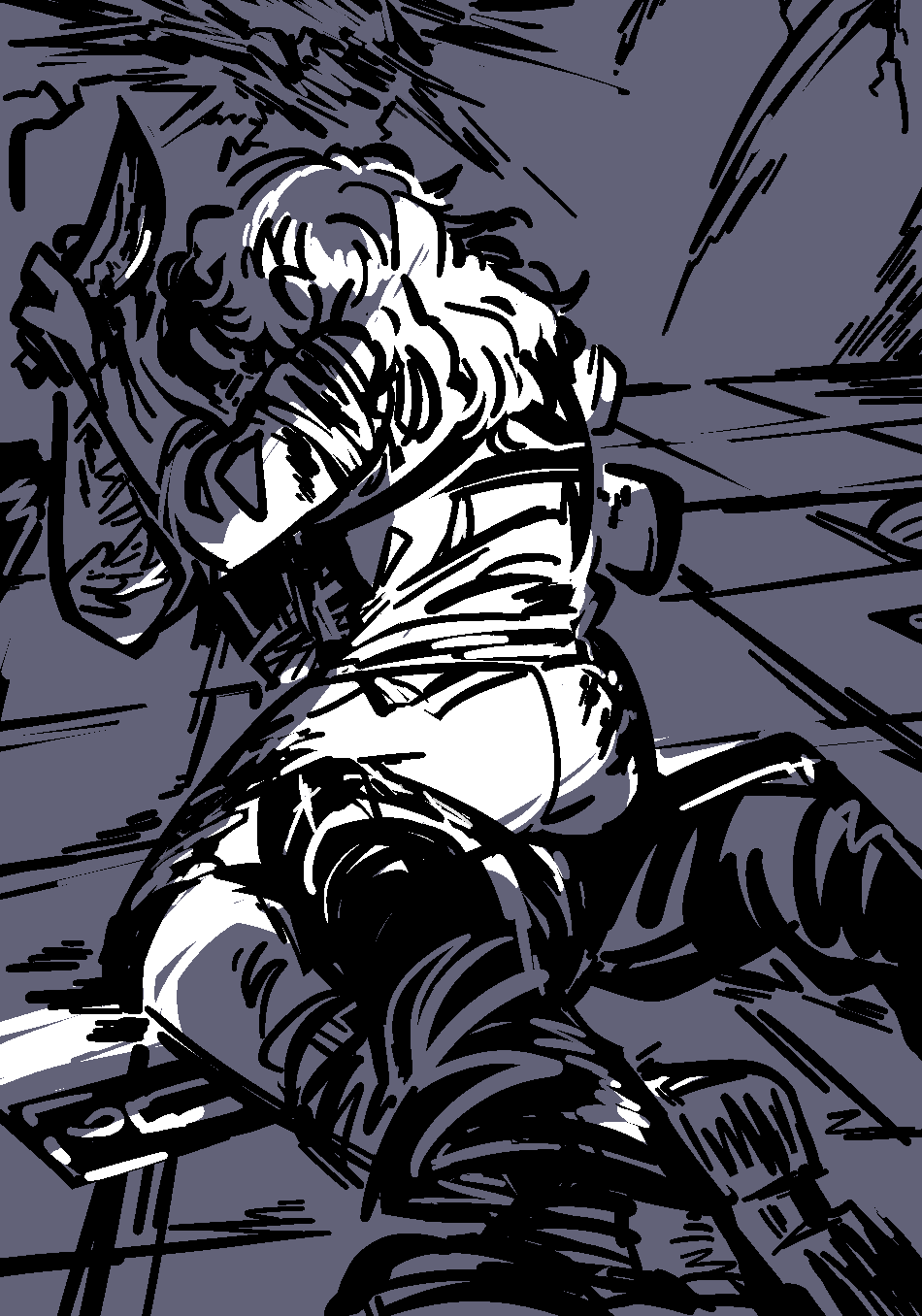 Your right hand, meanwhile, strains, veins popping underneath the skin. Your hunting knife's pierced through the divet of her other hand from when she caught your stab. Spent hemoglobin runs down from her palm to elbow in messy lines.
