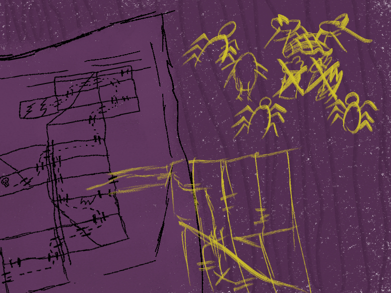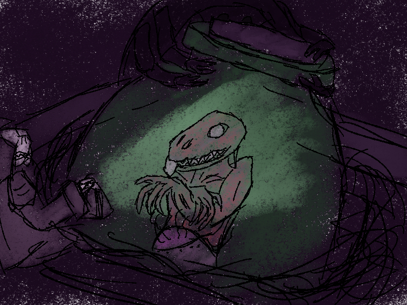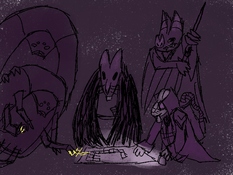 You tell the tragedy of Subtlety, the deer maiden who fell in love with a wolf. The big fellow listens raptly as you recount how the shy doe sought the help of the Witch to become a wolf herself and capture the heart of her love, only to find after her long journey that he had taken another deer as his lover, despite the ire of their families. Her despair turned to seething resentment, and she stoked the fires of jealousy and distrust between the forest folk to try and tear the couple apart. The fighting became so bad that it drew the attention of human hunters, and worse, witchfinders. After terrible losses the bigger folk of the forest were forced to retreat into the deep woods, where the Witch made such impenetrable snares and tangles that the hunters could pursue no further.