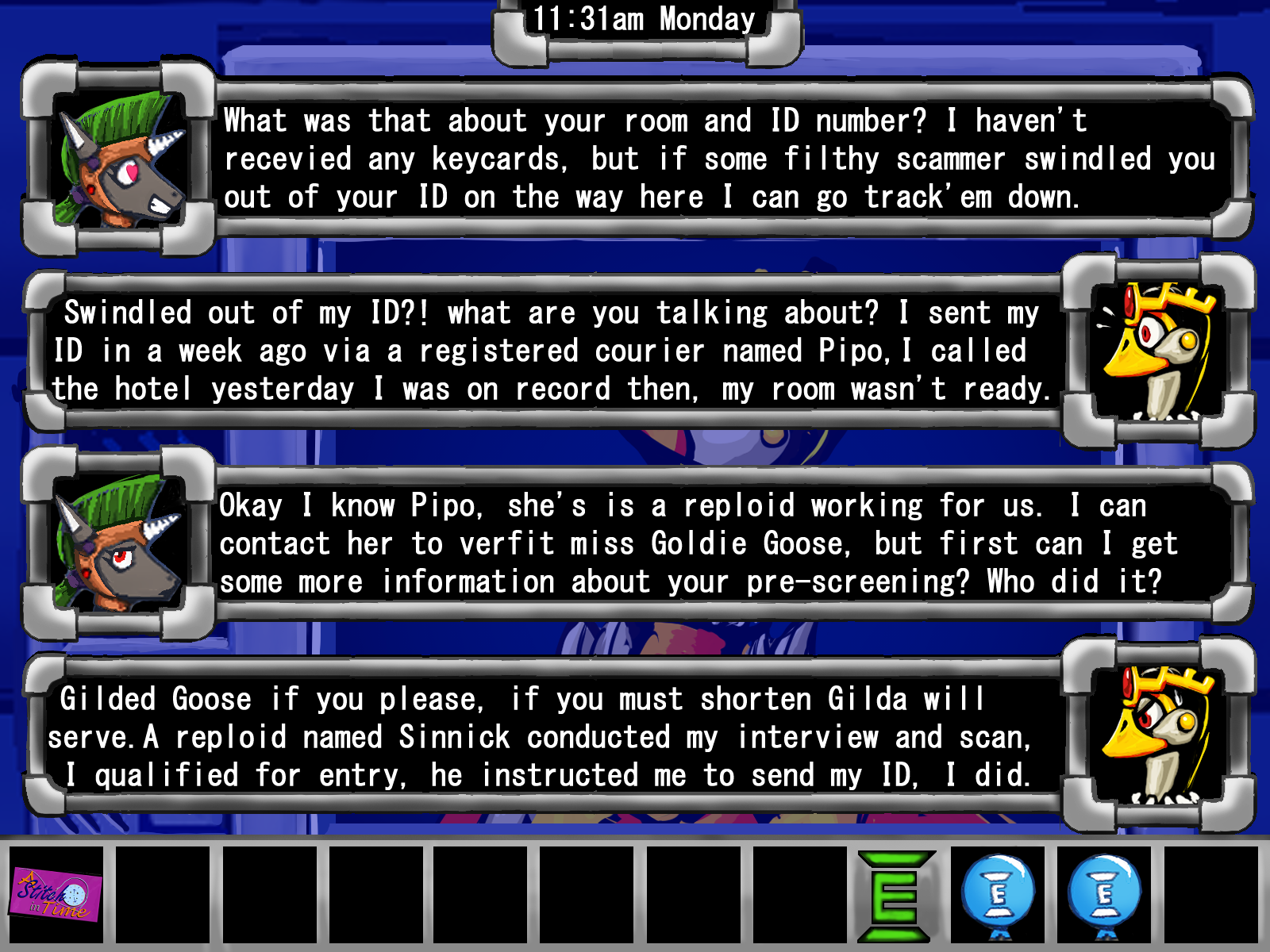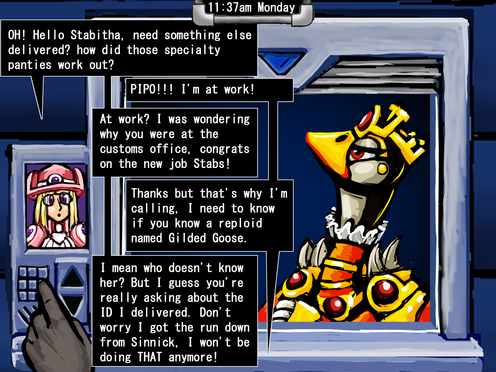 Well, this day just got a whole lot brighter (and shinier)! Not only is the next entrant another reploid, but she's the famous Gilded Goose here to meet us in person! Or an impostor trying to exploit her fame to bluff her way past security. A Maverick Hunter can't afford to let her admiration get in the way of investigating a potential Maverick.