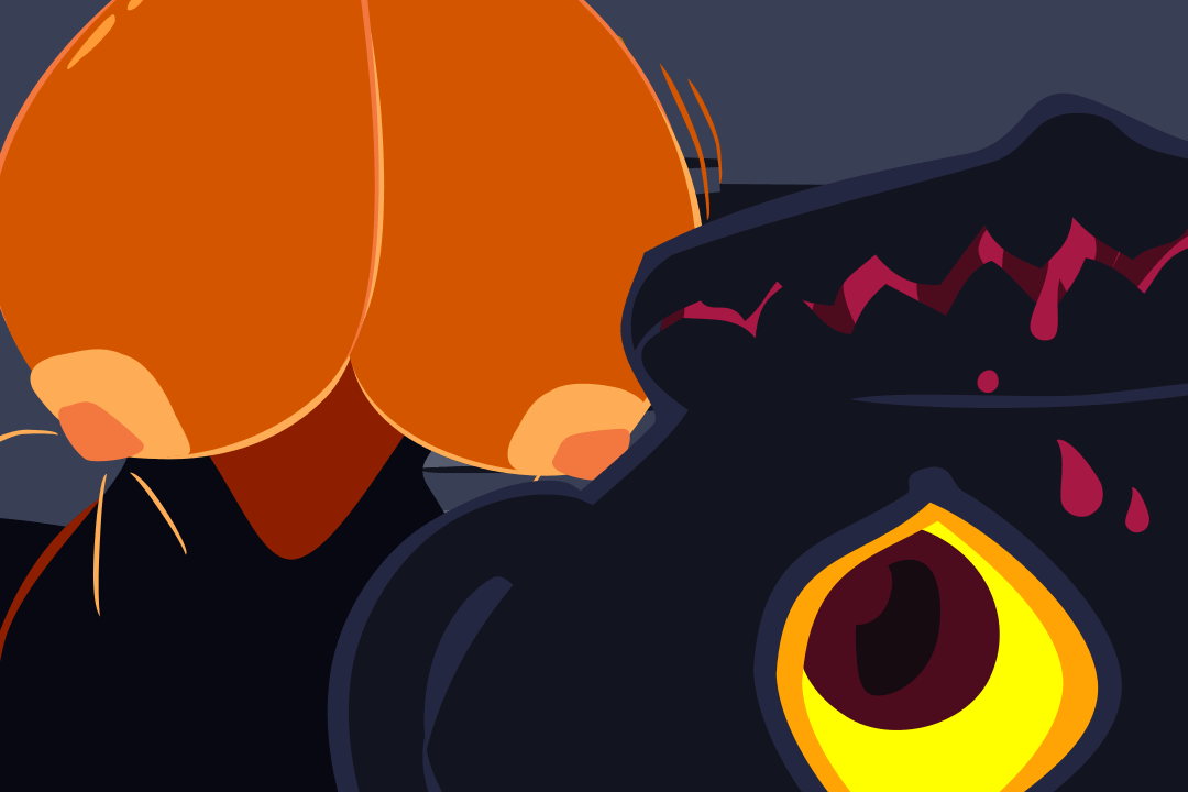 The slime takes a step back but is hindered by throwing Doyle to safety as Moriko unhinges her thagomiser into an expanded set of jaws and lunges at the tall slime. Her top half vanishes into the maw, but her ass is seemingly too fat to easily be swallowed.