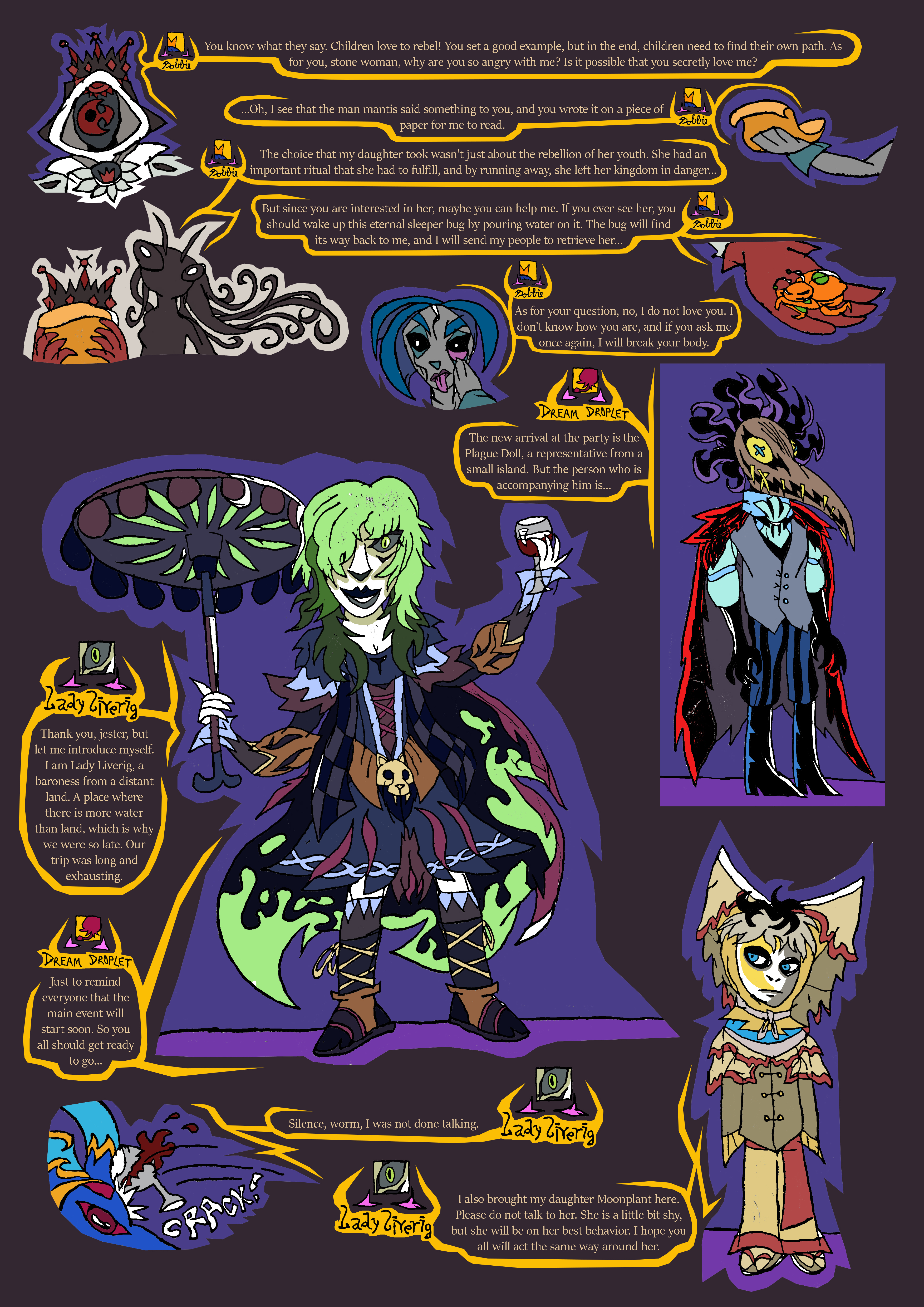 Mantis: crying over her daughter cutting ties with her after refusing to marry, have sex, and eat the head of her future lover. she can't speak our language, the stone servant can translate, but is pretty cold.