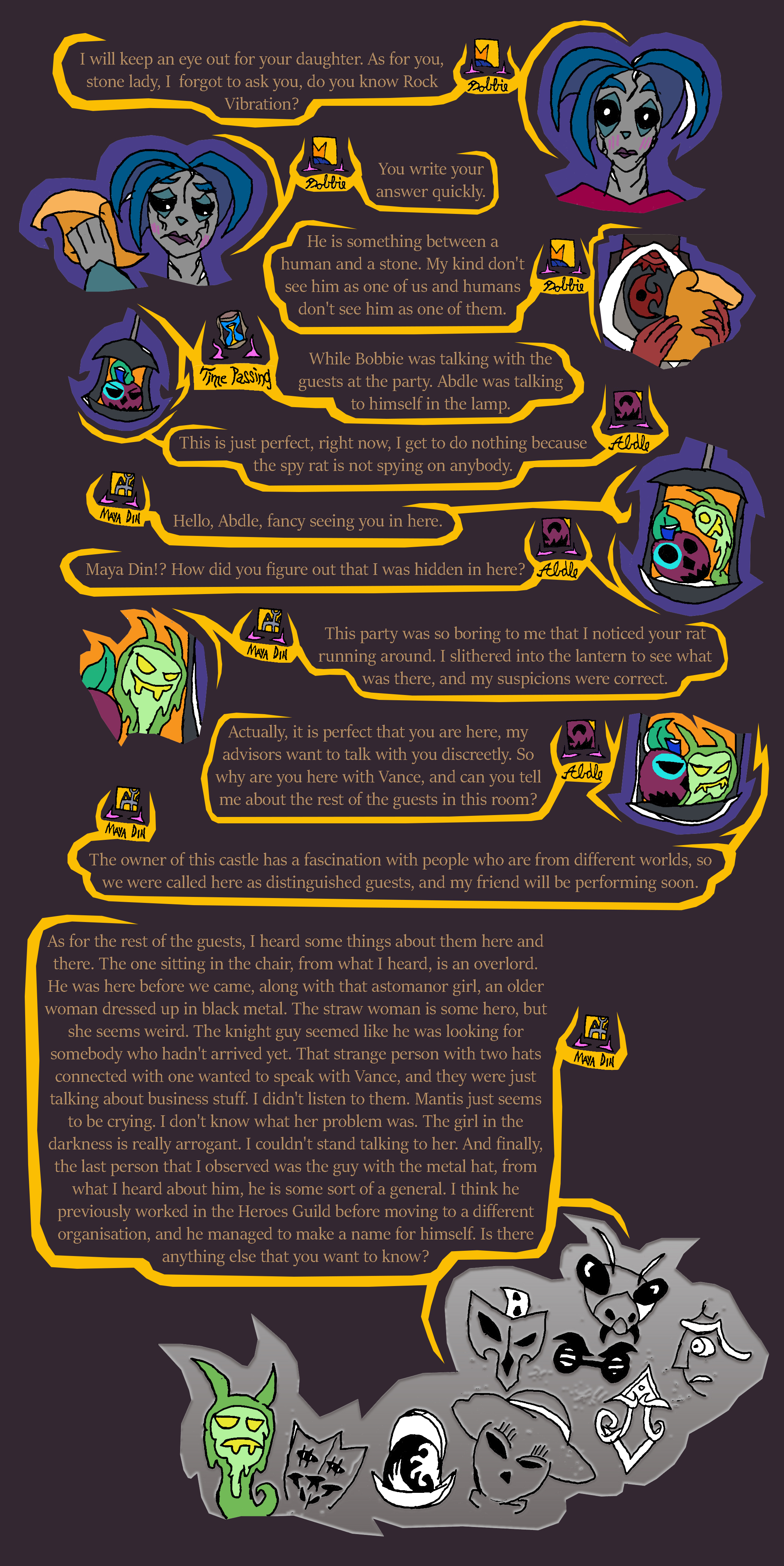 lastly, that was the second time today that spy rat got caught. We need to have a serious talk with Ratislav about training his rat spies, otherwise they could get caught and eaten. With that in mind, I think we shouldn't let spy rat back out right away until after Maya Din is done talking with us, and when the performance begins since that is starting soon. People will be distracted during that time to notice the rat.