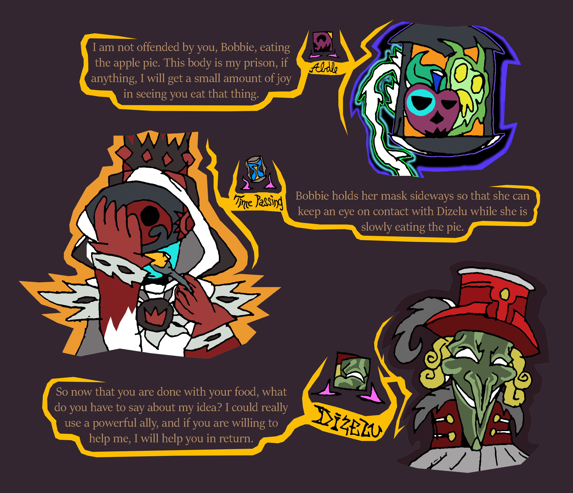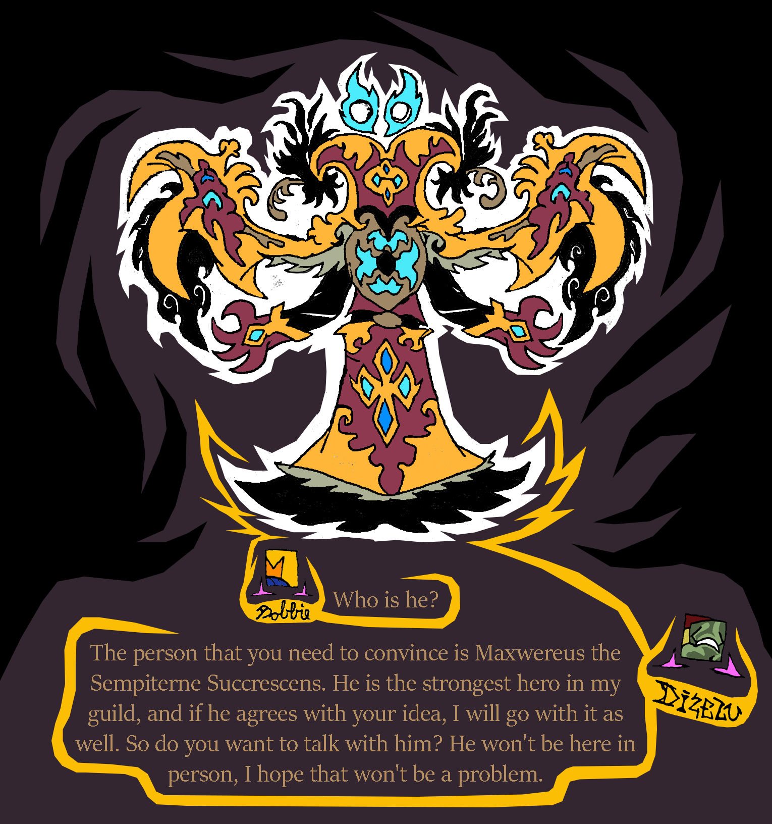 guy in green mask: Dizelu's the name. appreciated those paintings. Is looking for leader of the Banisters with the man in top hat and mask, Velucifio. Try not to look under Dizelu's mask, you'll die seeing his real face.