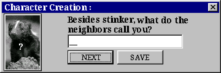 >Chose a name, gender, and profession for your skunk. Then click next to continue.
