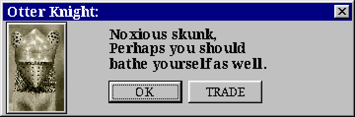 As you get dressed for the day, there’s a fierce knocking at your door. You don your cap and greet your visitor. It is one of the otter knights, holding a large sack. He goes out of his way to cough and gag at your sight.