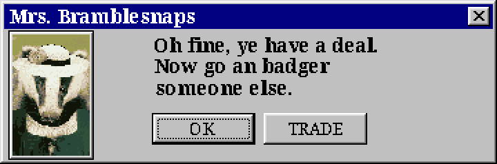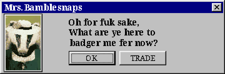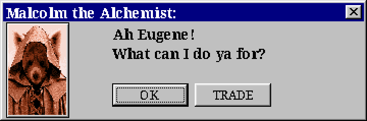 Malcolm: “Hah-hah-hah! Oh but Eugene, her majesty isn’t the one paying me for it. I’ve got a few other orders to finish up this morning. ”Where did I put that bottle of tree’s beak… Ah never mind. If you care to bargain for a moment perhaps we can work something out. I can brew up your usual order and some special ‘wine stain’ remover for twelve gold, three copper, top priority.”