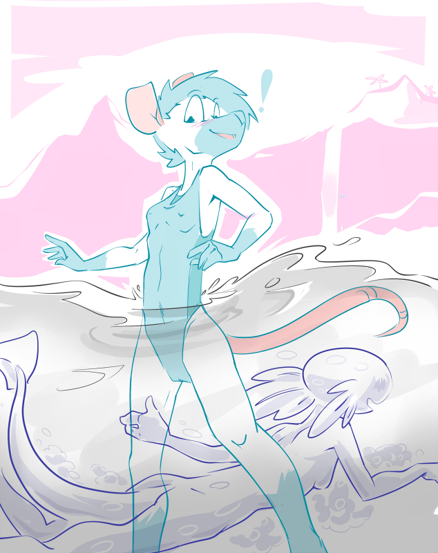 The waves swirl around the mouse as she stands still and pivots at the waist to watch for movement. She gasps as something passes between her legs, bumping up against both thighs playfully.