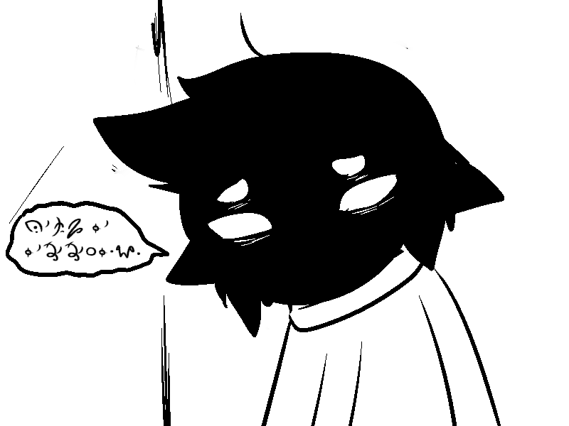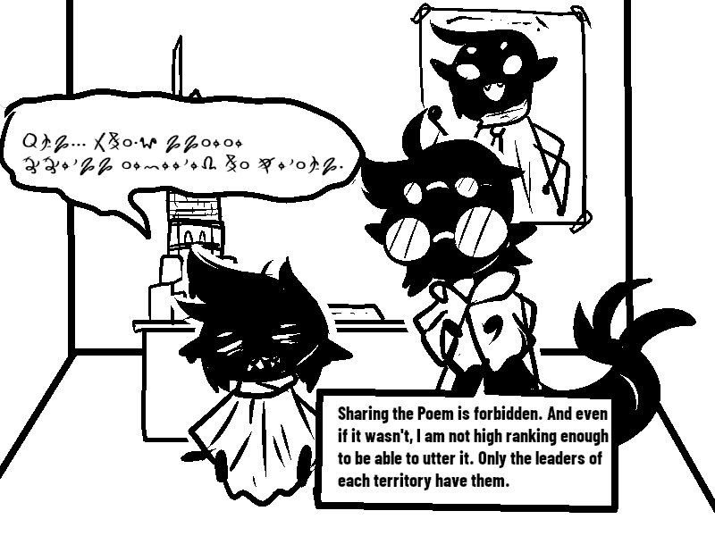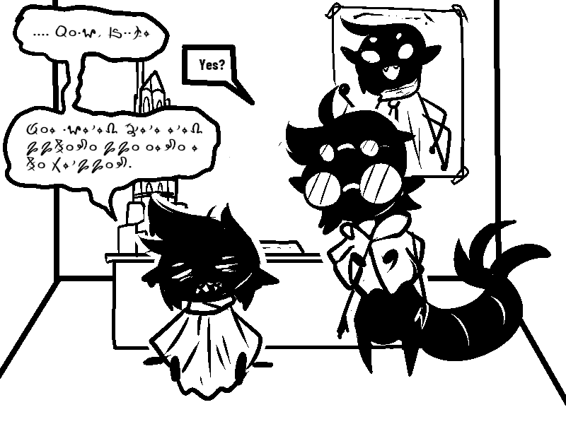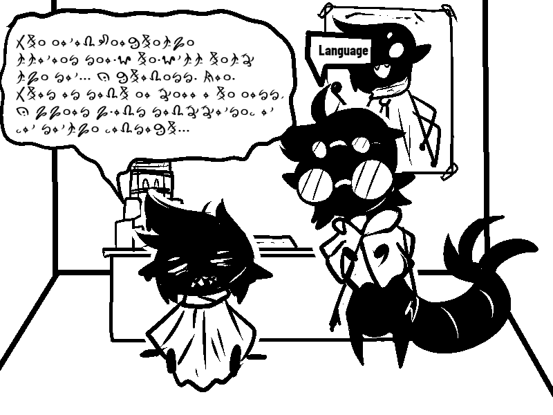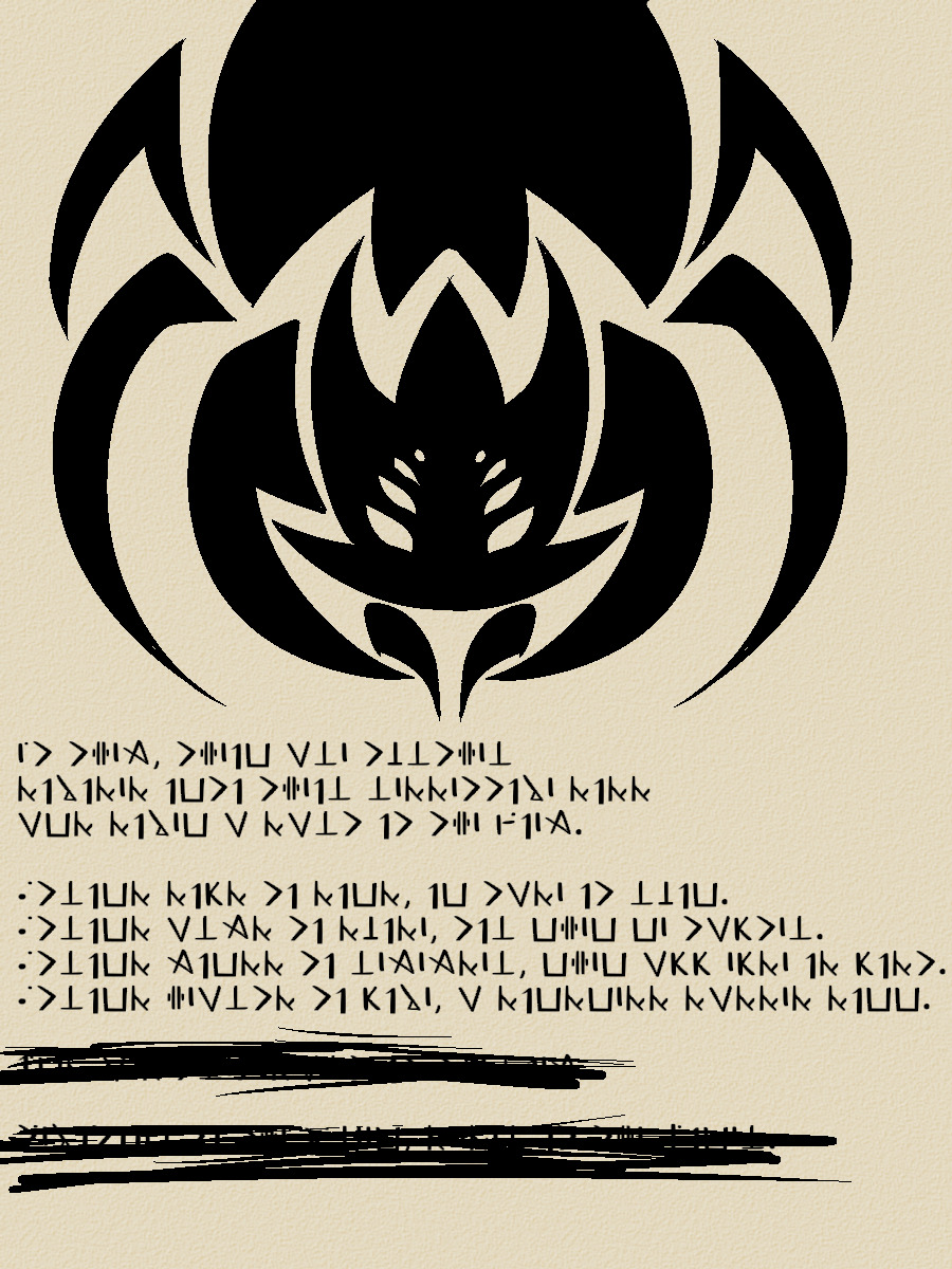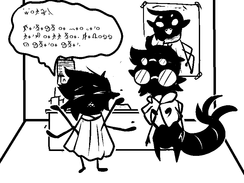 I also found it neat how it's just barely possible to translate that first scratched-out line. There's just enough bits of symbols sticking out that you can identify everything needed to figure out what's being said. Even when that one symbol can be any of SEVEN LETTERS lol)