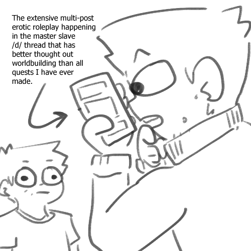 That’s why I’m asking YOU, dear suggestors. What would you want to see from a NSFW quest that has taboo kinks treated realistically? Is such a thing possible on modern questden? If not, what would you want to see from a more generic NSFW quest?