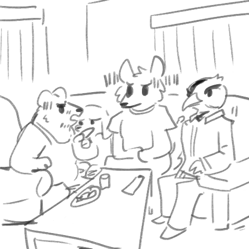 “Now I don’t like to hear you’ve been messin’ around with Becca. She’s a sweet, gentle girl.” the pika growls. “Ain’t you got a wife? She know about this?”