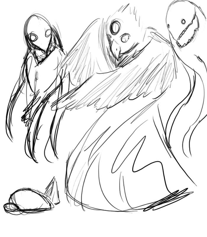 sup /draw/. I need your help. see, I've been working on creating a somewhat crazy D&D setting that has no typical D&D races. I have to come up with a fairly unusual species that mainly occupies every elemental plane. problem is, I can't come up with anything good for the plane of water that isn't some typical shit like mermaids or sahuagin. pic related; it's a low-detail sketch of the races of air, fire and earth. I don't know if this is better suited for /tg/, but I might dump some more shitty sketches in here later. especially if there are any requests.