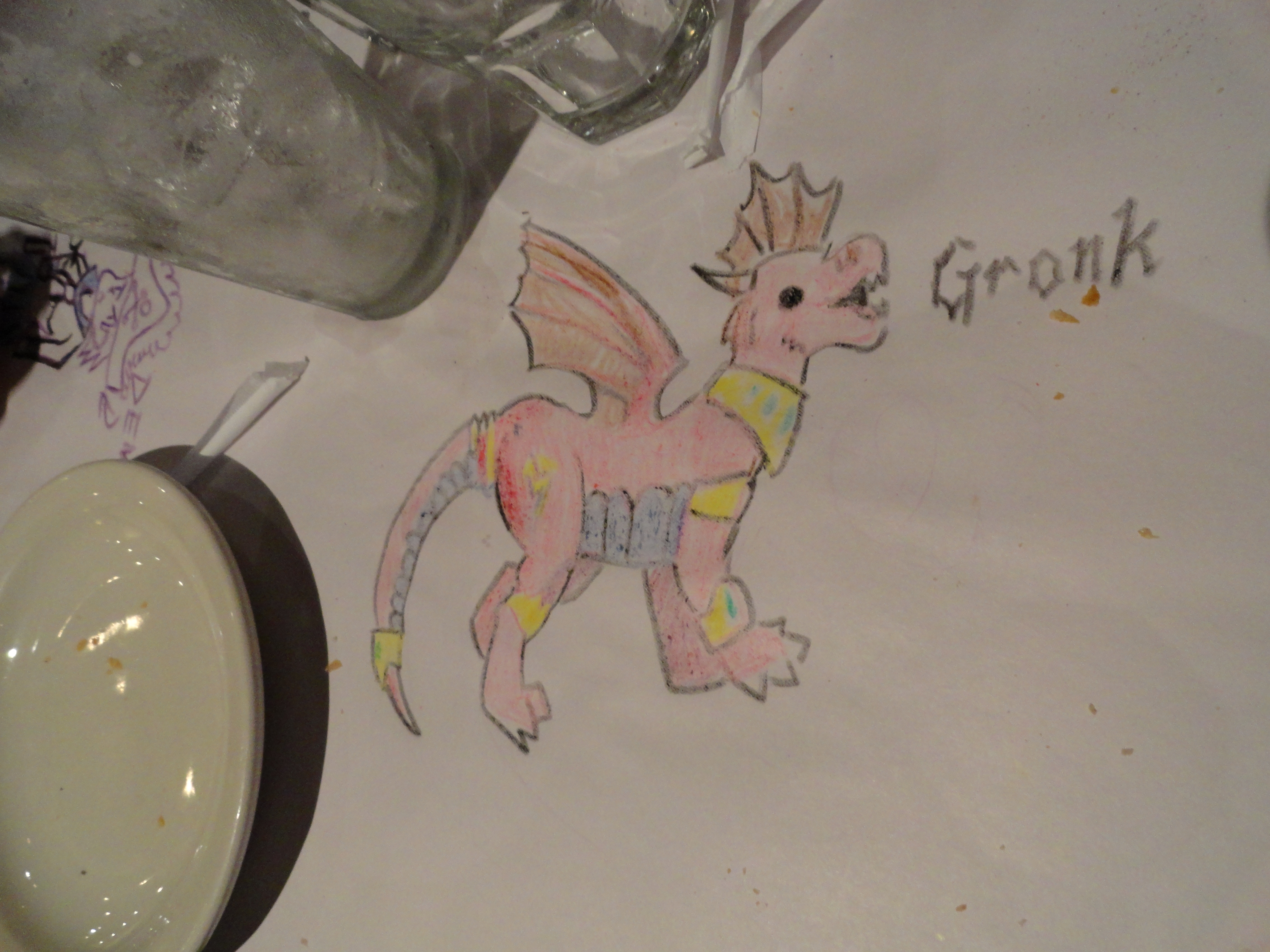 Photos of the table at Macaroni Grill, where we all ate fancy Italian food and drew crap. This is Capt. Slowpoke.