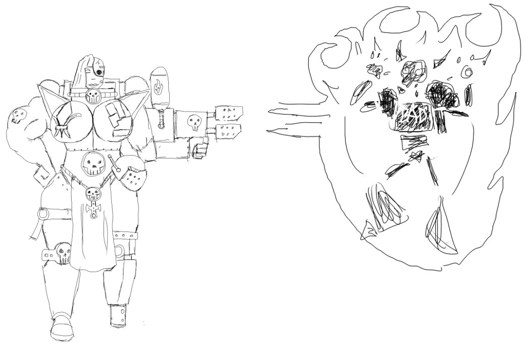 Someone dared me today on /tg/ to draw a Sister and here's the end result. Sister Huge, a giant sister who according to /tg/ has eaten marines, aliens, plasteel walls and even part of her own face. It was oddly pretty amusing, so I figure I see what you guys all throught of my drawfaggotry.