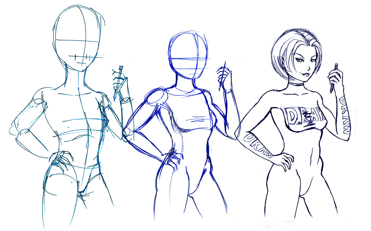 18.) Torso first: When drawing figures, a lot of people make the mistake of drawing the head first. Instead, draw the torso first. The torso dictates the direction of all the limbs and the head. To put it simply, starting with the head is like building a pyramid in reverse… except that the results in the latter would be a bit more catastrophic. XD The torso is the hub and if you draw anything else but the hub first, you risk wrongtastic looking anatomy issues later down the line.