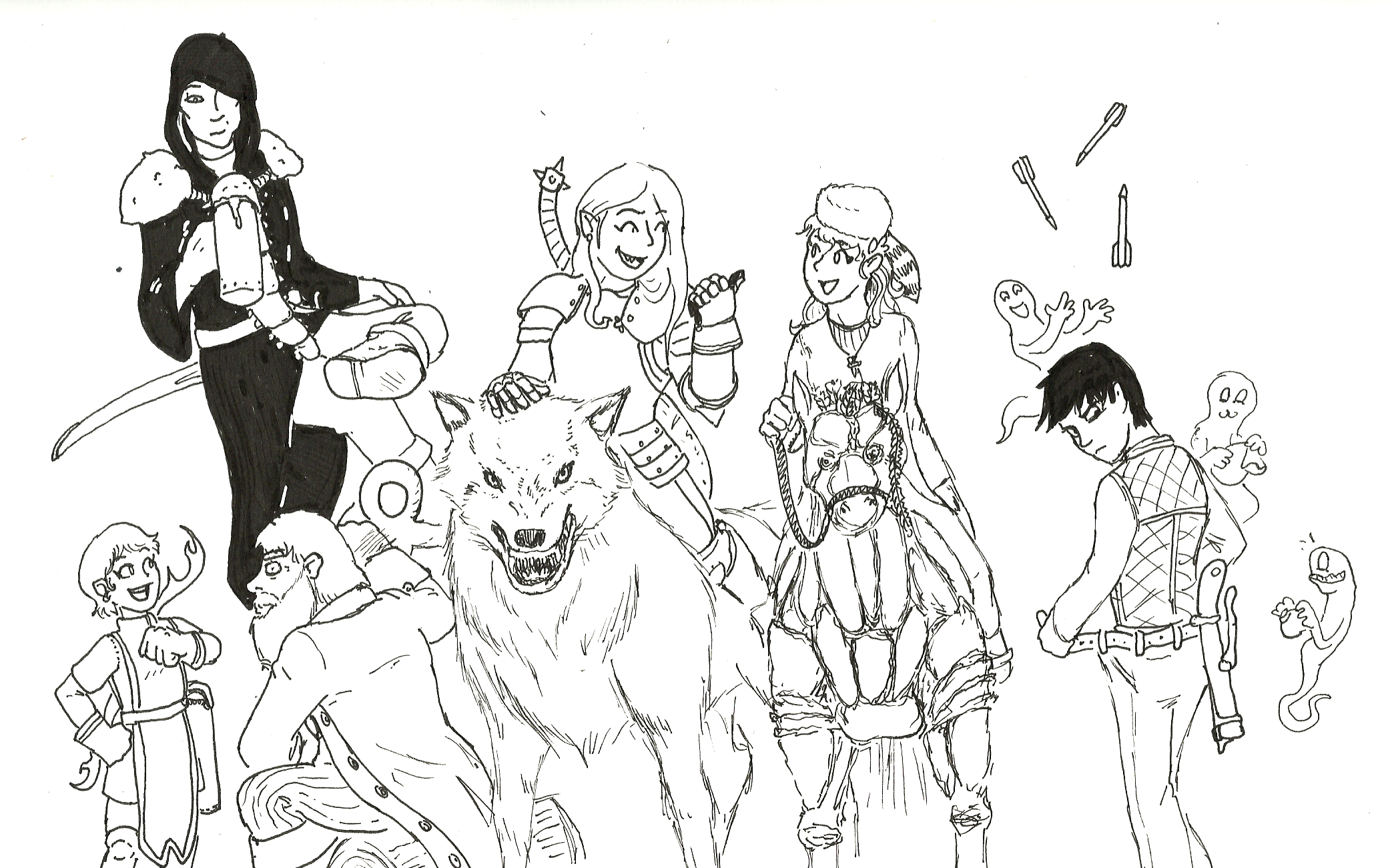 I kindly ask that you draw my RPG group in a family portrait. We play the Riddle of Steel system for our Mythical Europe game. It takes place in 1474, and we've taken over the whole of Romania over the course of the game.