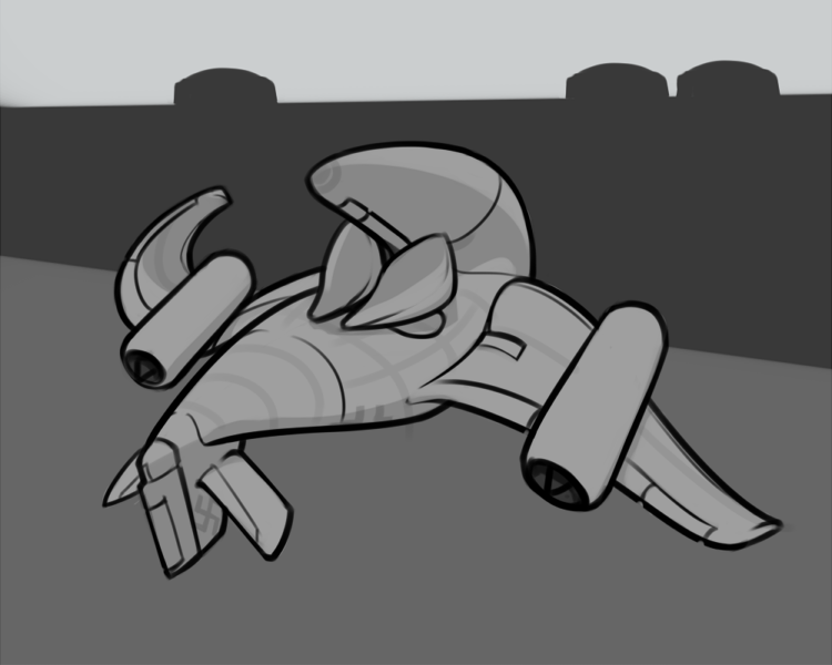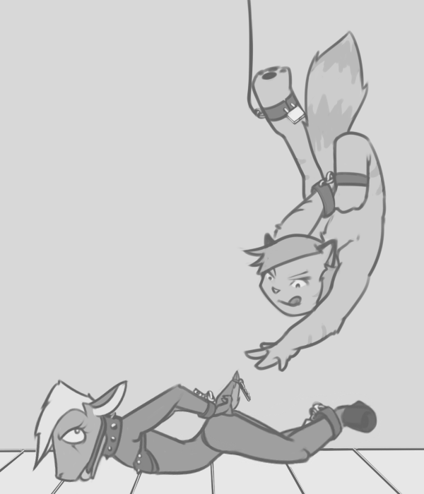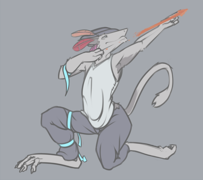 Southern sergal, in dull clothing with bright ribbons flapping off various points.