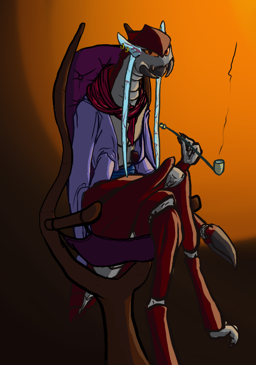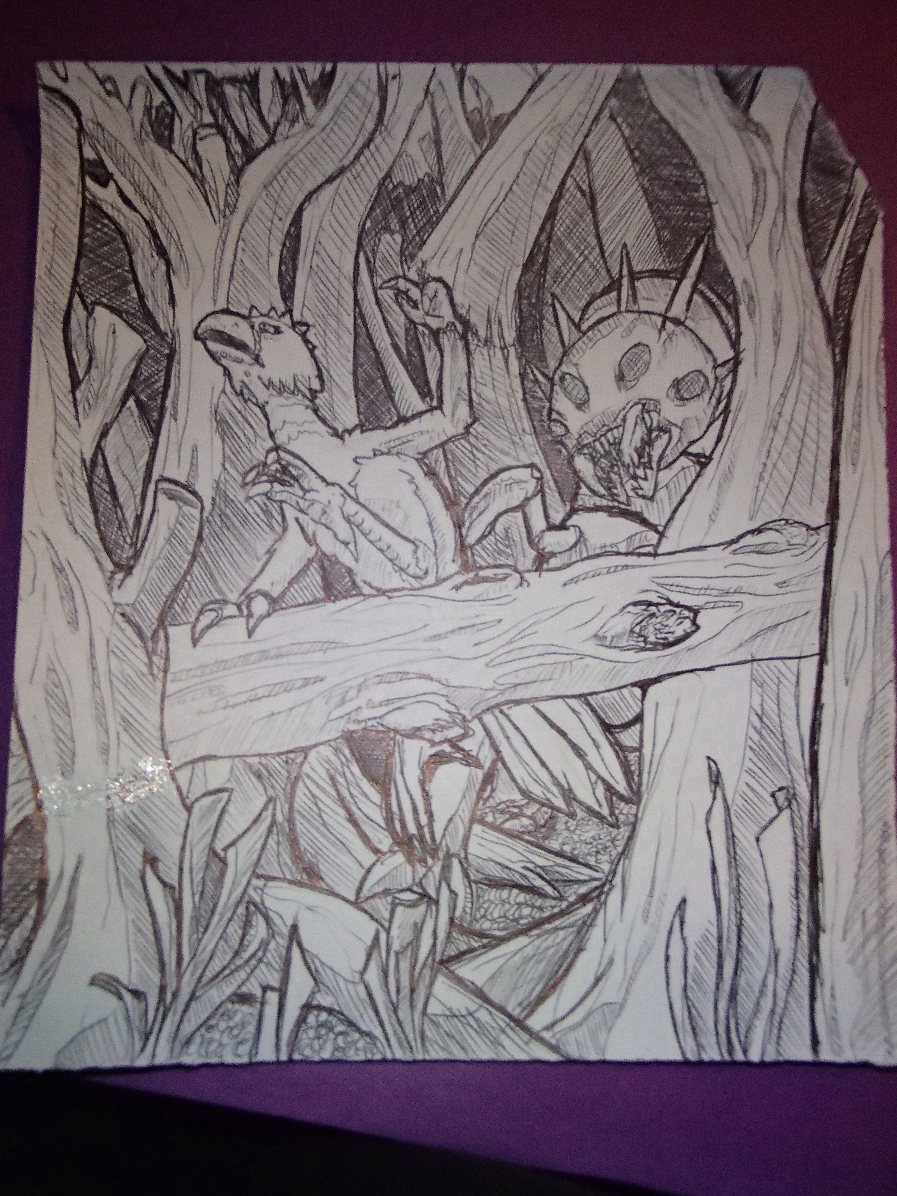 >>37105 Heh. There's actually a little story to that scene. It was to be part of an introduction for a tribe in a sort of civ game. A young aggrod (bird race) appears to be fleeing a higitain (giant bug), but is actually luring it into an ambush. Two other aggrods would jump down from a ledge atop the beast and strike it down. Then the tribe's chief awakens from her dream of her first hunt, in which she had to be the bait. Around then, it would be revealed that they are no longer in the swamp or jungle (haven't decided which), but rather the tundra. Here would begin the story of a tribe forced away from its ancestral homeland.