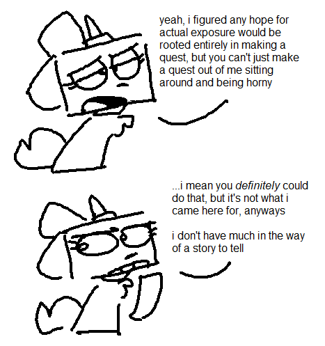 >being horny >ask me to do things Put an elongated object in your mouth. >i don't have much in the way of a story to tell If you need help with a quest setting, how about this: Unikitty is horny but she can't assist herself with her poorly-designed hands, so she decided to go on a quest. Help her reach orgasm 3 times by the end of the day! I'm sure suggesters would find plenty of creative ways to help her reach her goal heh