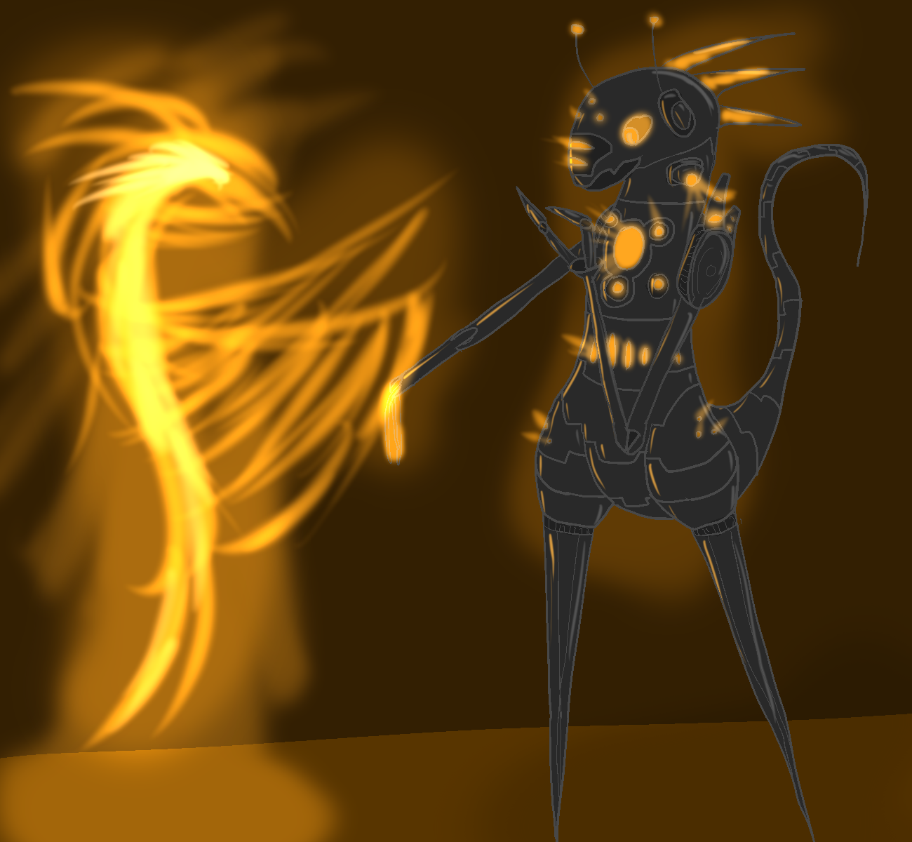 The cenesu, or 'witness of miracles', were created as specialised tools to seek out new artifacts and were given the senses required for the task. All functioning cenesu can see the slightest traces of mystic forces beyond the known universe. The avian-humanoid aesthetic came as a compromise from the two most outspoken members of the design team, being a member of an avian species and a human respectively.