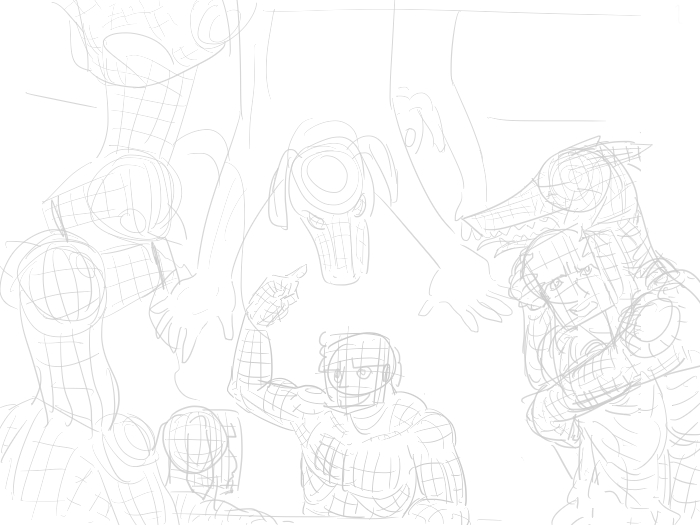 Could you draw a shady establishment, with a bunch of equally shady people in there? Basically, a front of a thieves' guild, a weapon store or such, with some of the thieves in. The setting is sorta arabian nights flavoured, Al-Qadim if you're familiar with it: curvy knives, robes to cover from the desert sun, a lot of sunshine from the window or two the place has, still leaving most of it into shadows.
