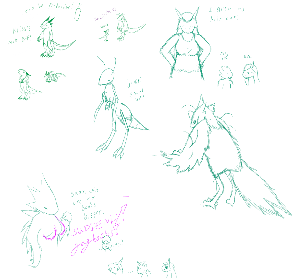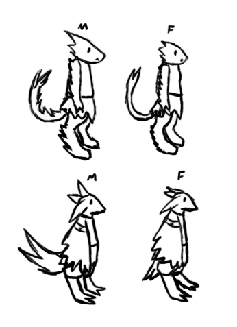 This was the original image that began it all. I designed a bird and a spikey guy, then made alternate genders. Everyone voted on who the hero would be, and the opposite became someone he or she would run into.