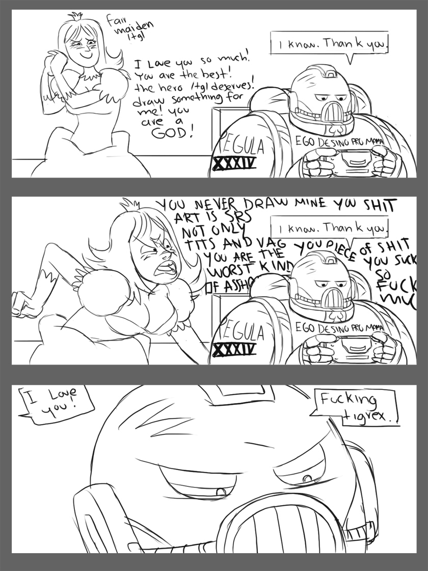 Hey greenmarine, is it safe to assume you know about the Primarchs Daughters writefagging? If not; alternate 40k 'verse, the Horus Heresy didn't happen, the Big E decided the Primarchs needed something to calm them the fuck down so he created them some daughters. Someone Else has been writing hundreds of pages of PD, mostly about Venus (Salamander) and Freya (Spess Voffs). The following text is how he described her cerminonial dress.