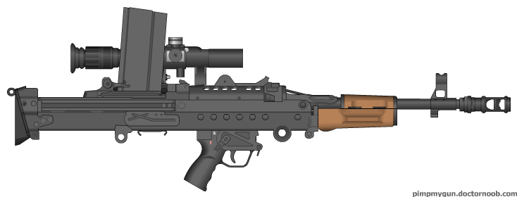 On a completely unrelated note: Enjoy my serious attempt at making my own gun. I was going for some kind of Bren gun thing using some of the new M249 parts, but then I had to figure out how I'd do the sight system and before I knew it I had a sniper scope. Also the stock sucks because M249. Enjoy.