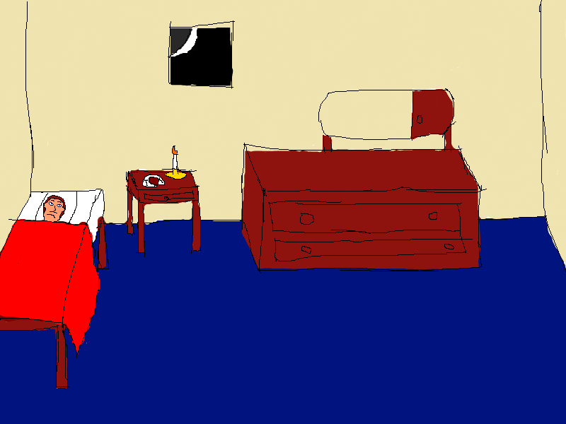 Quest restarted. You wake up in a bed of fine red linen. The only light comes from a candle on the nightstand next to you. From what you can see, you're lying naked in someone's bedroom, however, you are all alone. The floor is blue carpet, and there is a dresser with a mirror. Next to the heavy wooden door is a lightswitch, and the clouds outside are nearly invisible through the window looking out to the night. Actions?
