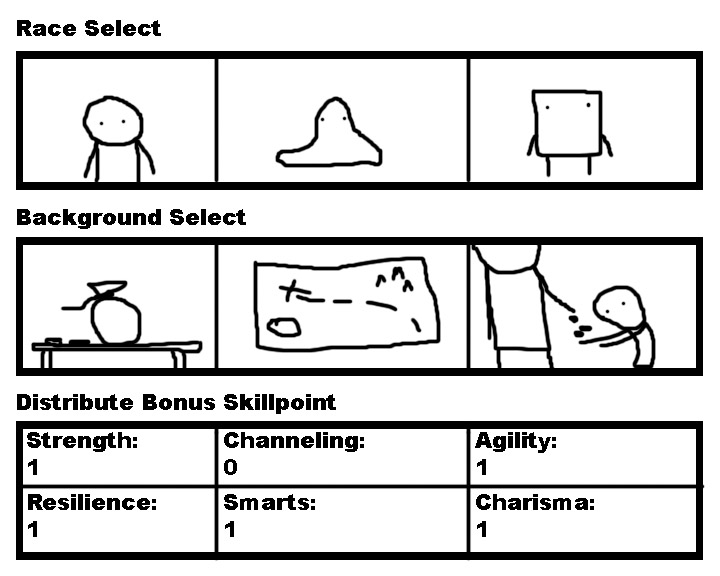 Race: >Humenkind Humenoid race boasting great versatility and the title of First Civilized Species, which was presented to them by the Grand Humen Council. Bonuses: May allocate 2 Attribute Points at game start instead of 1. >Slimes Amorphous creatures which once plagued adventurers on the road by providing easy EXP grinding. Recently have begun integrating into Humen society with mixed results. Naturally attuned to magic. Bonuses: +1 to Agility, +1 to Channeling Penalties: -1 to Strength >Squarefolk Small creatures that live among Humens. Secretive and stubborn, they are harder to kill than cockroaches. Bonuses: +1 to Resilience Gender: Message too long. Click here to view the full text.