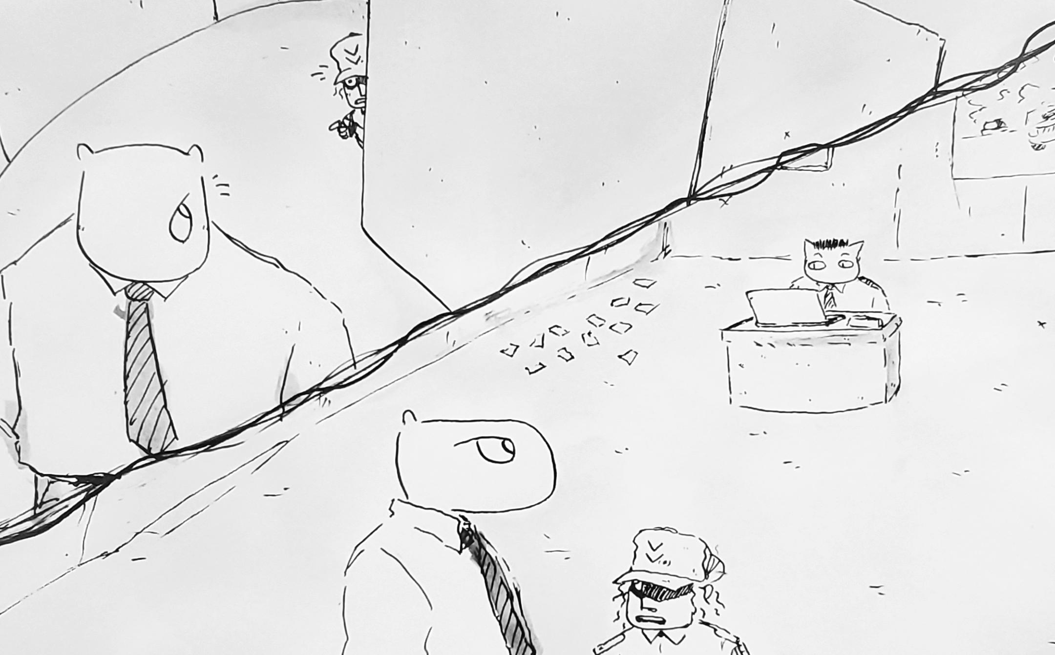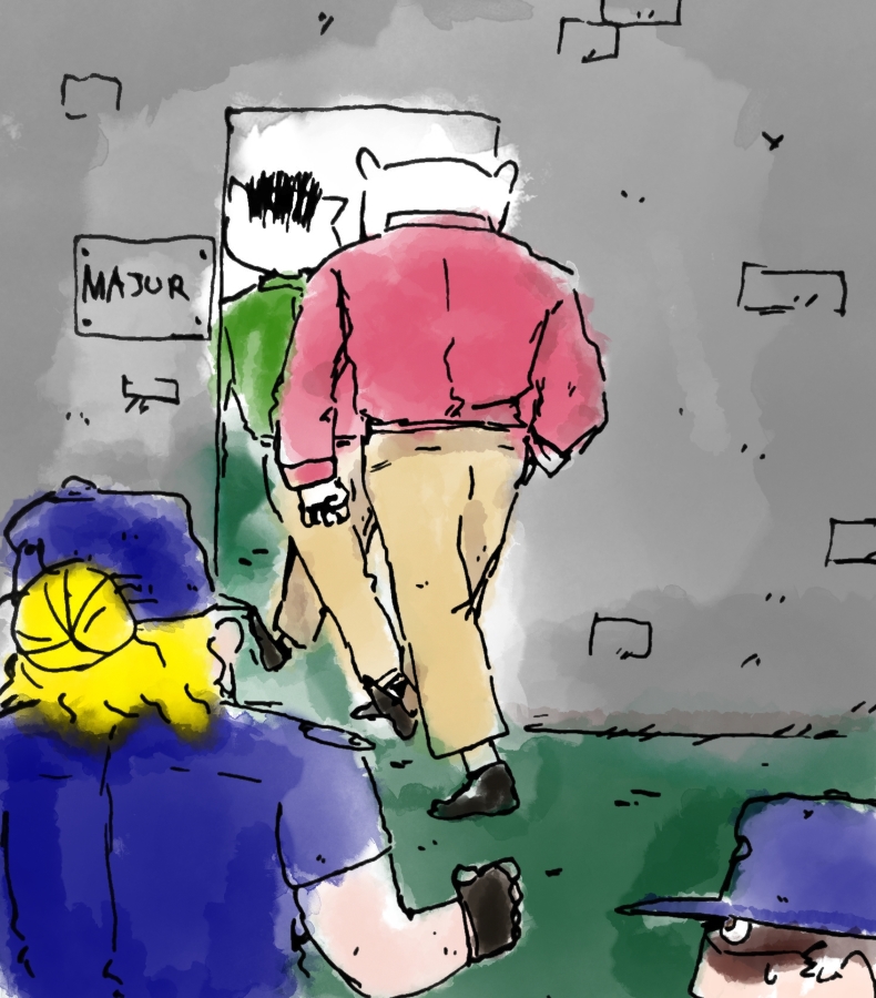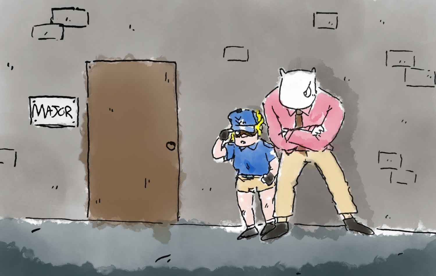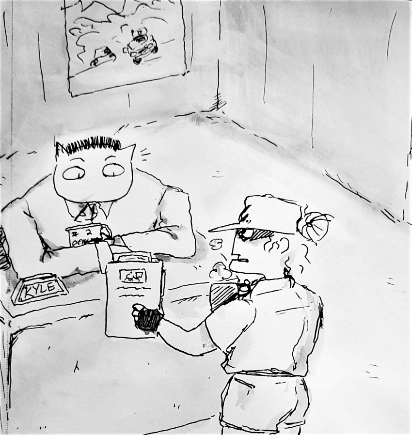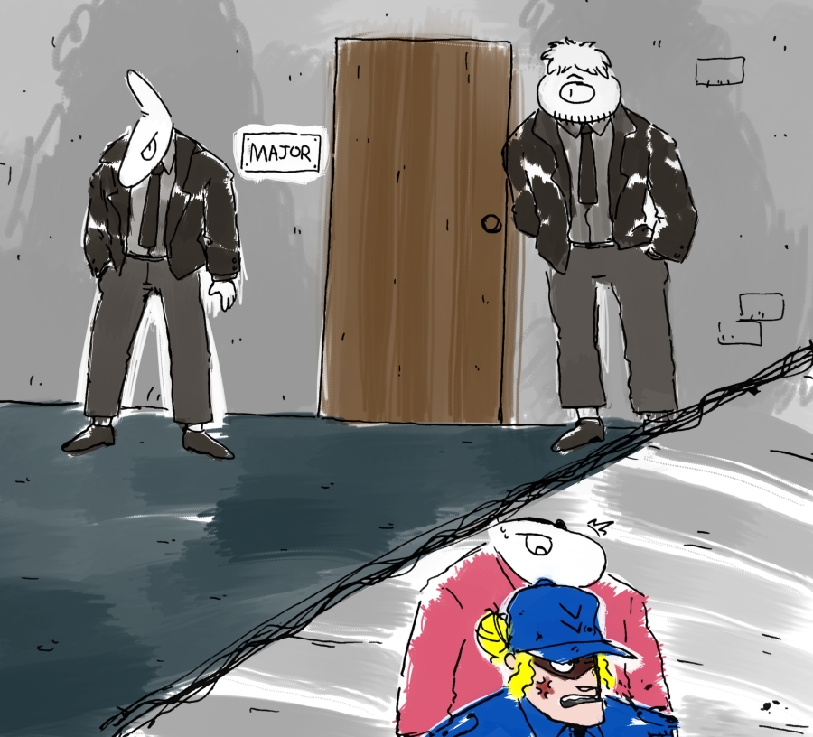 The Major gives you and KYLE a strained smile when you enter. Your actual boss is standing over by one of the windows, tending to a pot of coffee. HALE is currently occupying her desk.