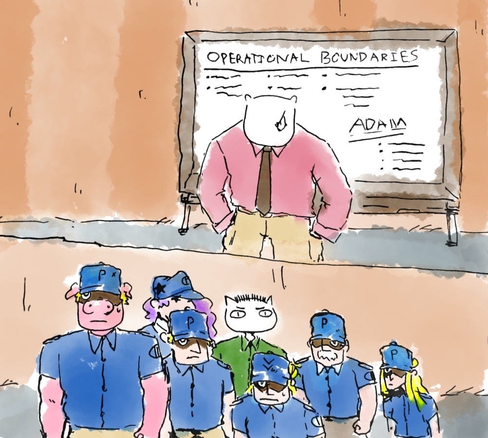 >"Good question. That relates to the main point of this meeting--operational boundaries." HALE pauses to blow on her mug. "For the duration of this operation, everyone in this room is working with the clearance of a subordinate agent. You have free reign to act as you see fit in completing your assigned tasks, and if the circumstances call for it you can collaborate and pool your resources as you see fit. But there's one important rule: no actions taken by any subordinate agent may interfere with the head agent's own intents or actions, or with general operational security."