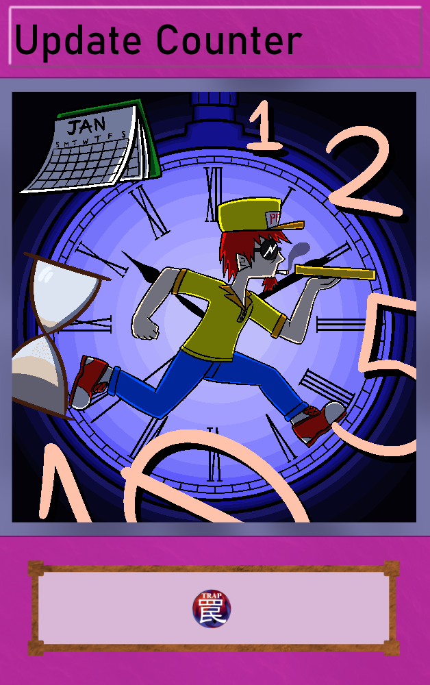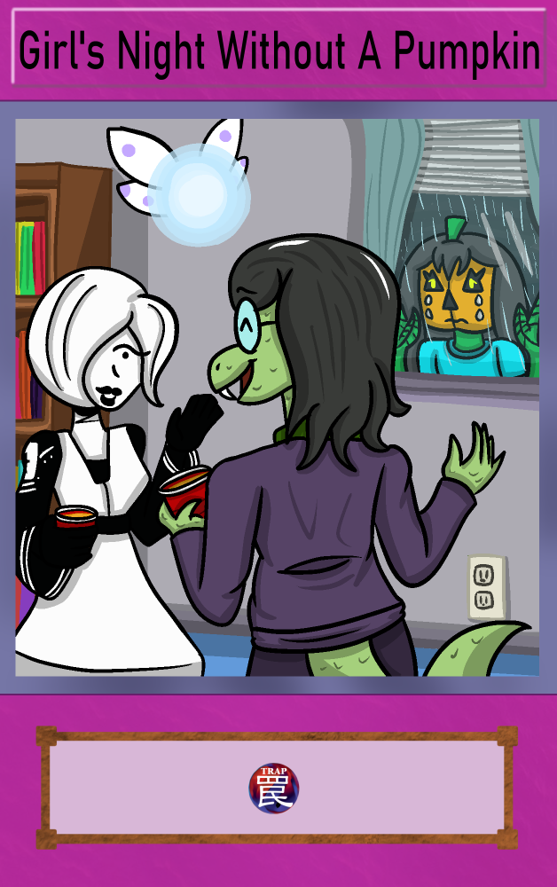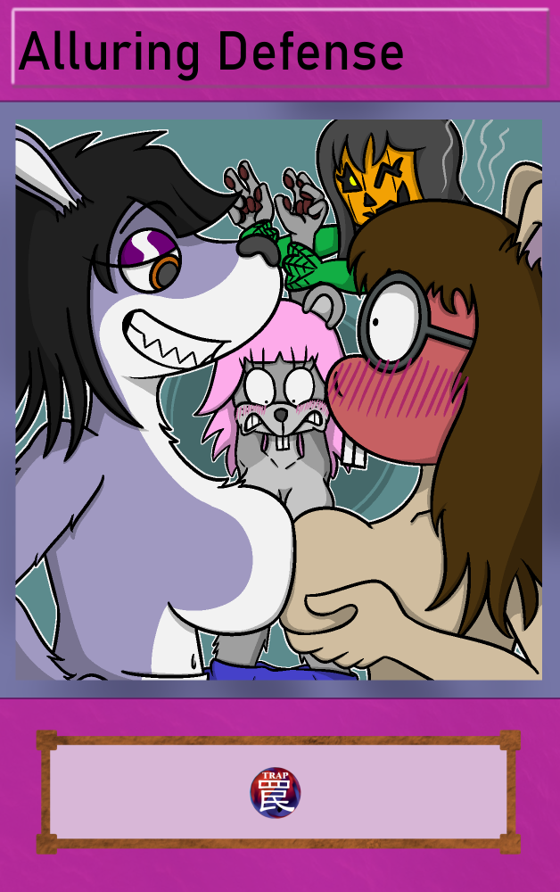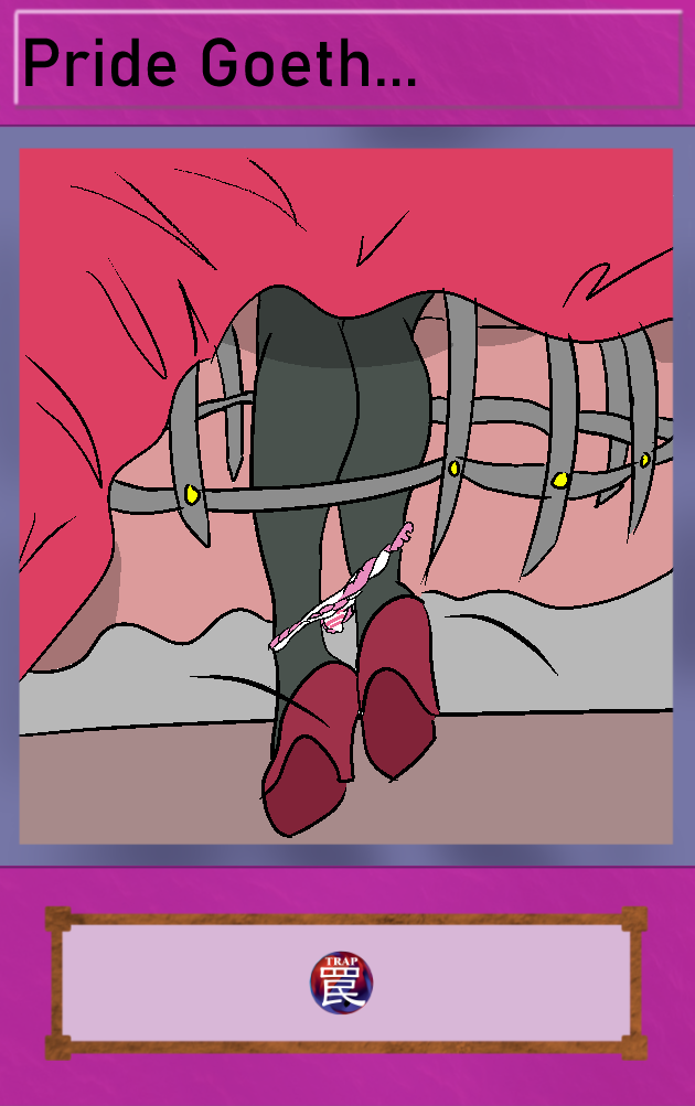 “I must concede you are right, my soon to be former rival,” Strawberi says once Tianna returns to her previous post, “I can only raise Njar’s attack points so far by using Godrender, but I’m afraid that doesn’t mean I can’t lower your characters’ points as well. I now use the trap card I’m Dazzling, You’re Baffling, which lowers the ATK or DEF of every character wearing no equipment cards in the field until the end of turn. Of course, I choose defense.”
