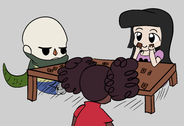 “This game sucks.” Ceridwen remarks, resting her head on her hands.