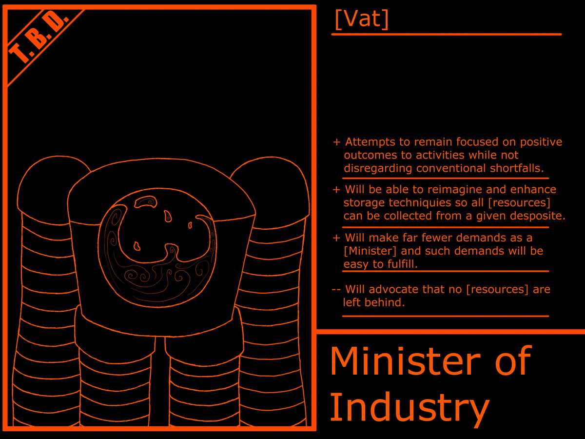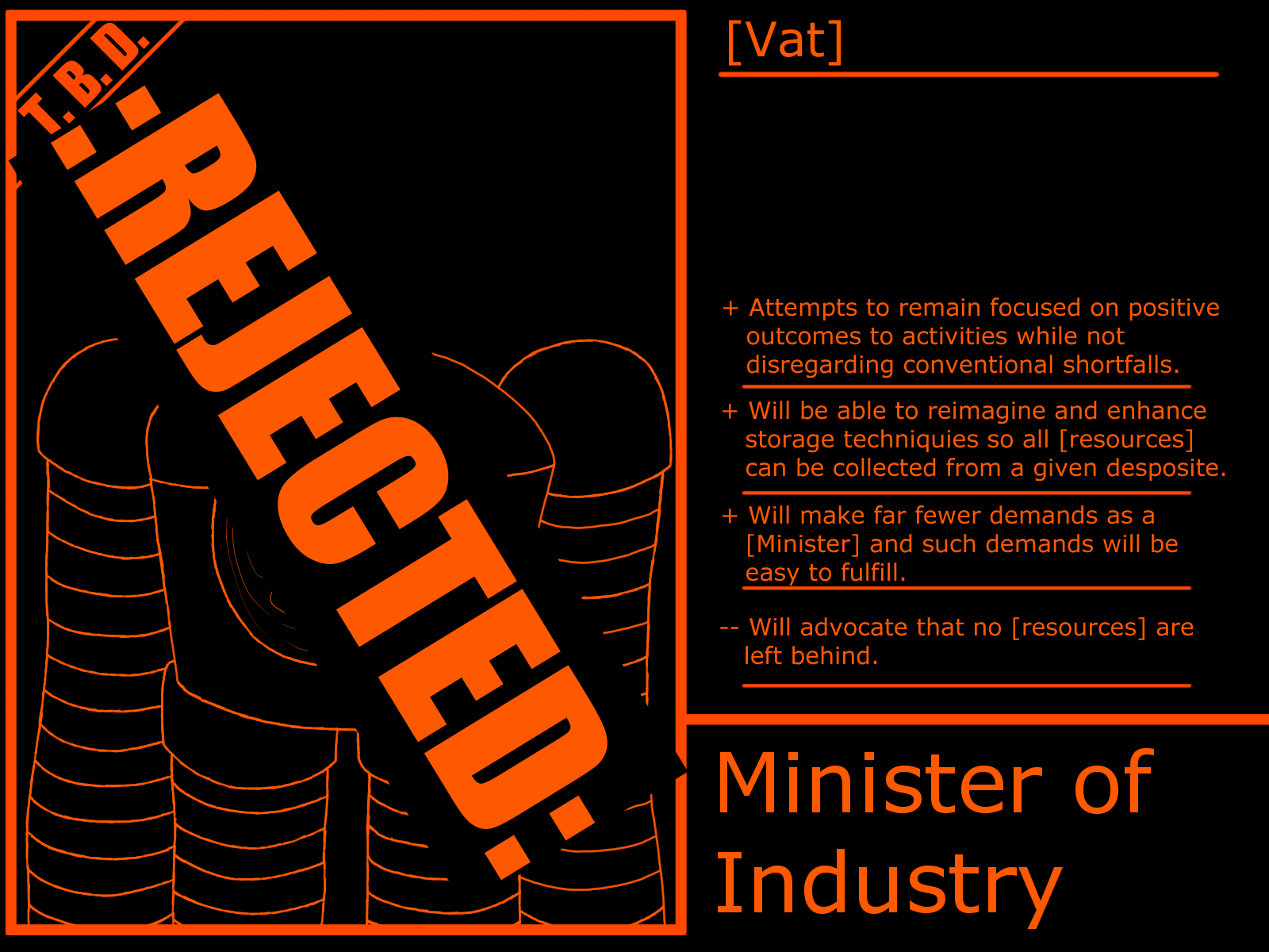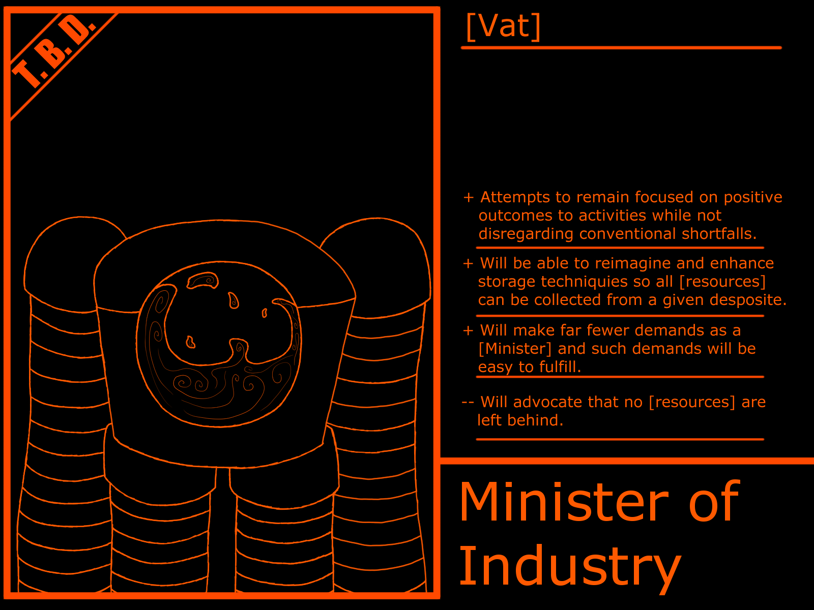 >Ah, this is something we were planning already. Modification of the [Crucible] to utilise inorganic resources. I think we should take a Minister of Industry for our first pick.
