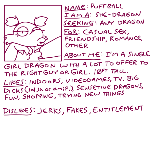 About me:I am great and mighty dragon with a great hoard, I love burning things and eating people, sorry about my profile pic, my cellphone I stole from a serf broke while I ate his family, so the lighting is off. At least you can see my red crest show, ha ha, you like?