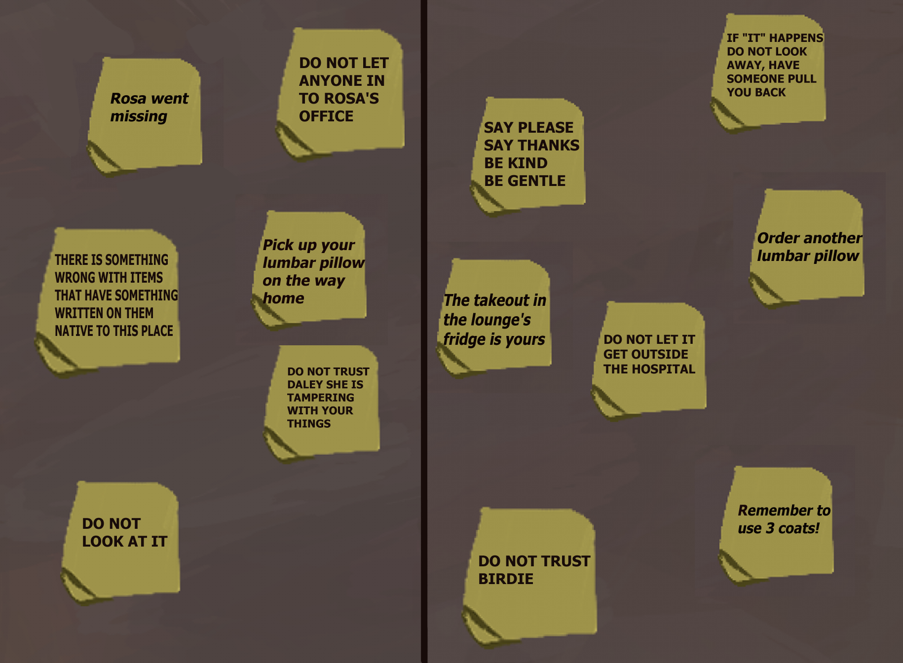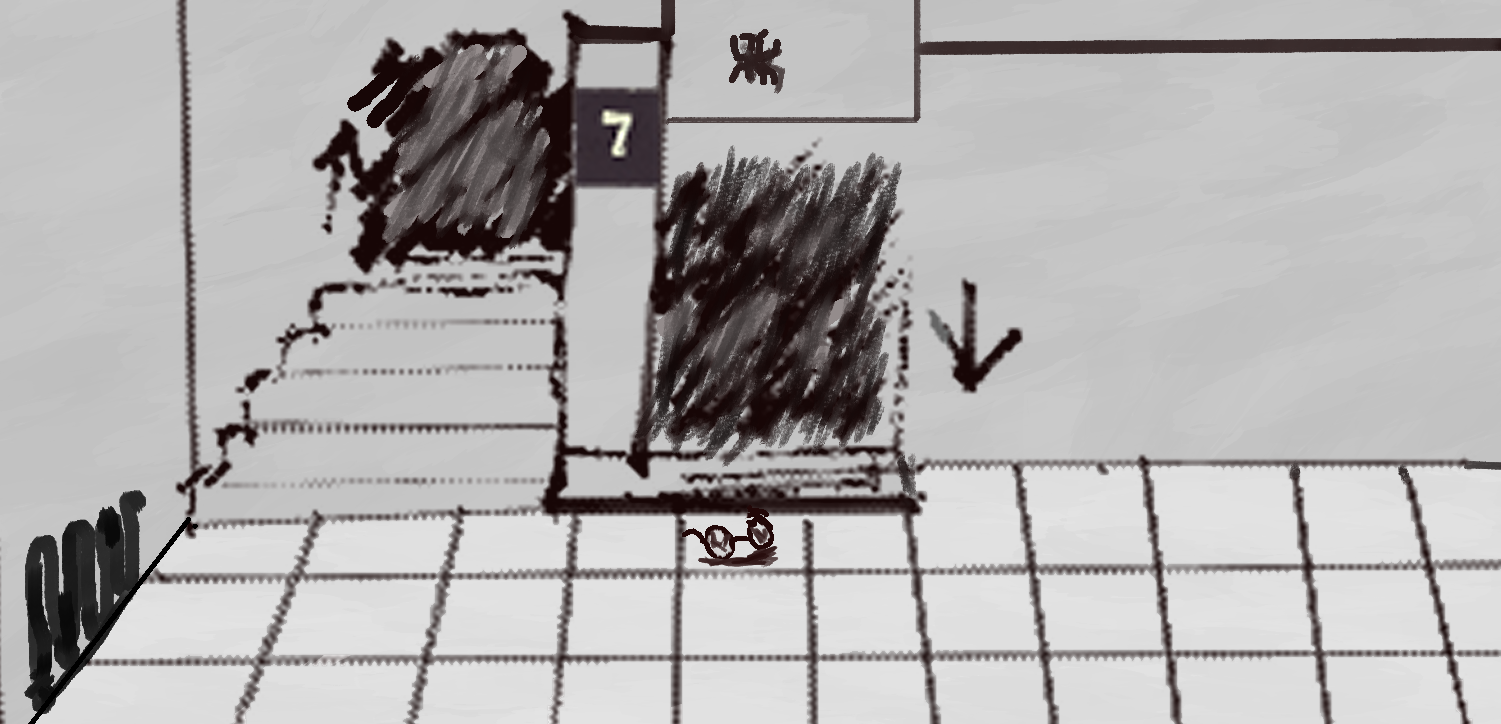 SC is moving further down the halls, as he moves away you feel colder, that lighter must have been keeping you warm, on each door SC passes by, he stops to place an ear to it; before moving forward, he only seems to do it on the doors to the left , after checking each door he mutters “safe” before moving to the next, you still stand at the door you entered from; you can hear the sound of metal under pressure and rushing liquids to your sides.