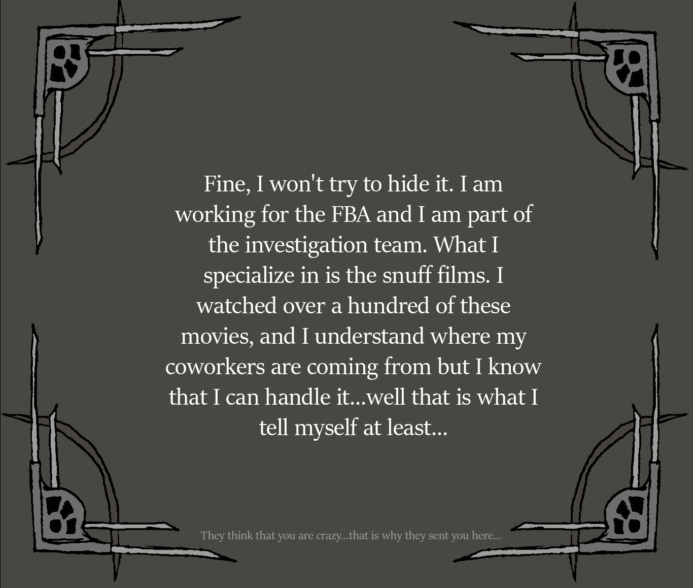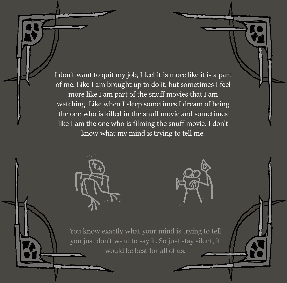 "At first, I thought I could take it, I've always thought I was someone with thick skin, especially after seeing the kinds of files and investigations I've seen. but as I continued viewing those films, I started to feel disturbed and disgust towards how far into depravity and evil animality humanity is willing to commit. I eventually started to become emotionally numb to it, whats the word... desensitized to it, and emotionally detatched towards others as I know what terrible things they can be capable of doing... And what worse, if anyone is capable of just snapping and doing some of the horrible things and be desensitized enough to commit such atrocities in those films, what if with how desensitized I am feeling viewing them, I am no different from those criminals?"