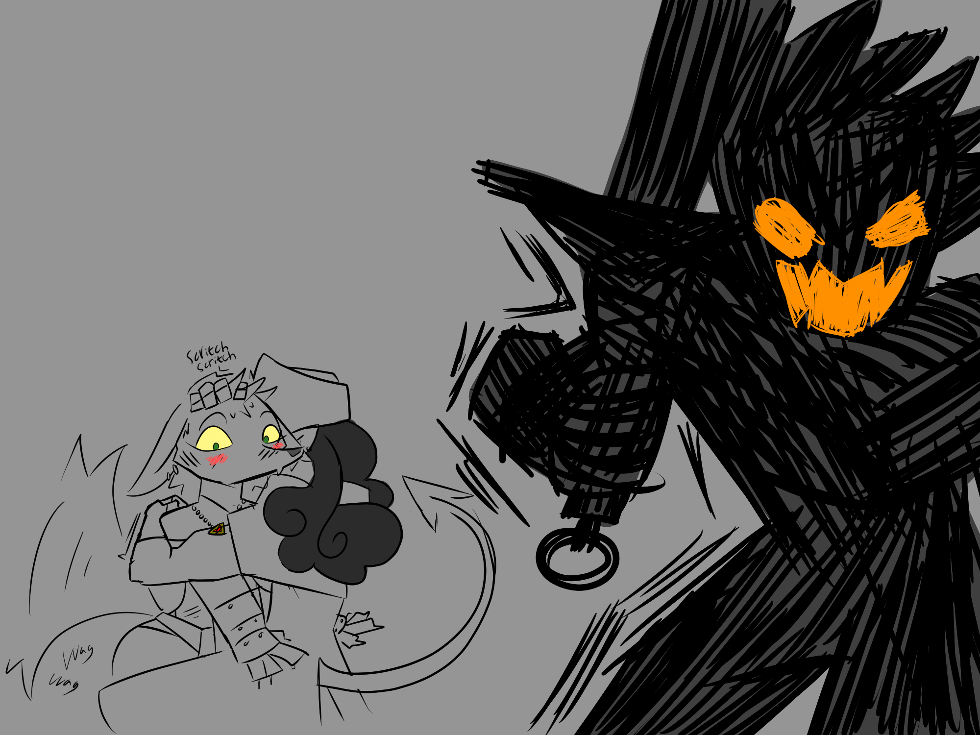 Runi nods, and stares at the pot and the thick tallow on its floor and sides. she thinks about Taalsen. she's very kind, very warm, and apparently very willing to hurt a partner... Runi wonders if she could handle Taalsen, but she knows she wants to try. she catches her paw sliding down her tummy. Runi shivers, realizing that she is very aroused. something about grinding on an elf girl's cock got her worked up. she sets the pot near the fire, to let the tallow heat up, and stands to look around for something to occupy her hands. maybe she should just go out to rub one out before Jess and Dia get back? or maybe she should just distract herself with a chore? or should she maybe try to continue things with Taalsen?