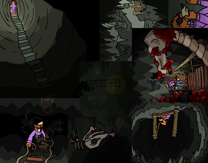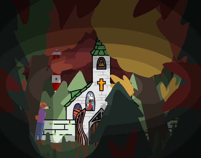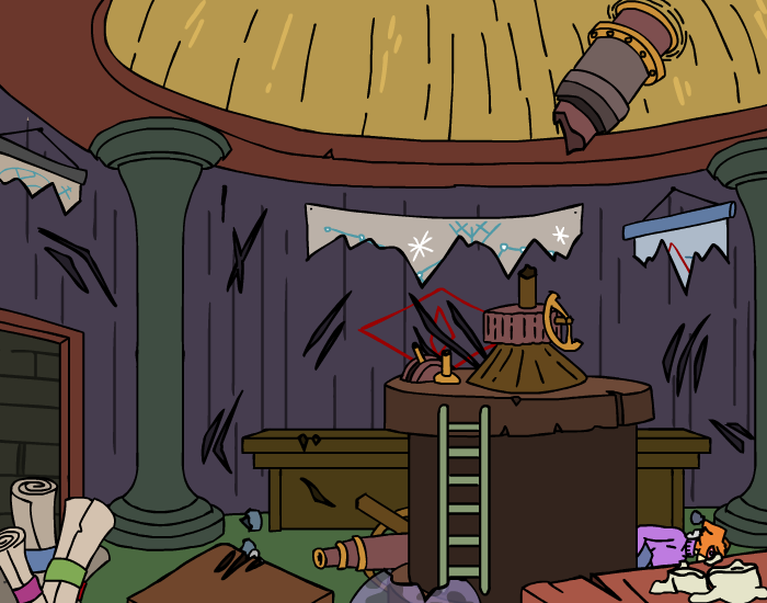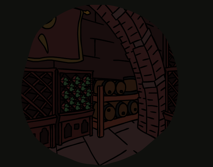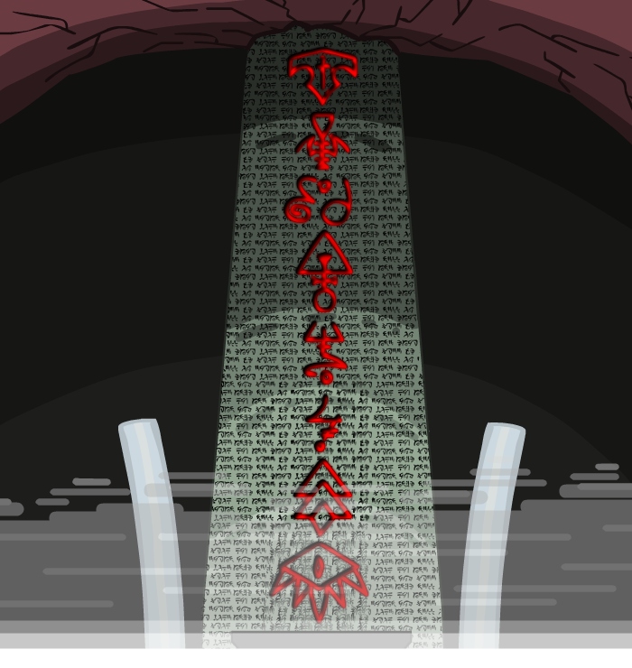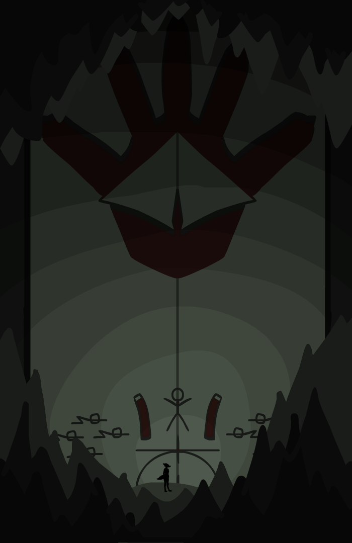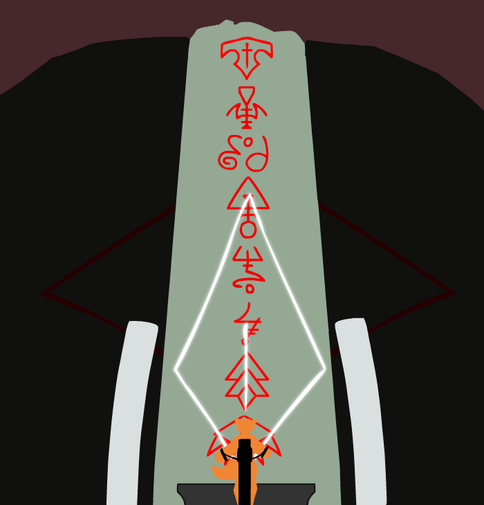 Getting closer to the altar, you spot a strange pole sticking up from the mist right in front of it. This one is also clad in manacles and chain, but looking closer you can’t help but find them rather peculiar. There isn’t a lock on them for a key, but a simple mechanism… a mechanism that the very person wearing these bonds would easily reach with their other hand, making them useless at keeping someone imprisoned. Clearly they can’t be that badly designed, can they? Looking over at the altar you can see two brass stands suited on top of it. One small and covered in dust, made to hold some kind of long, rectangular object, while the other is a lot bigger, one end supposed to hold something round while the other something very thin. Someone has clearly taken something from the bigger stand rather recently, as the dust has been disturbed there.