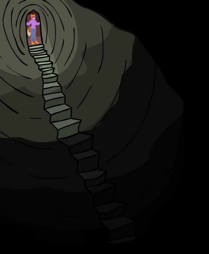 Moving slowly, you slink down the stairs and into the thick mist below. The ground is uneven here and covered with soft rocks, which crunches beneath your feet each step you take. Still, as you make your way towards the center of the grand chamber, you can’t spot anything moving in here… nor anything that seems to be out for your blood.