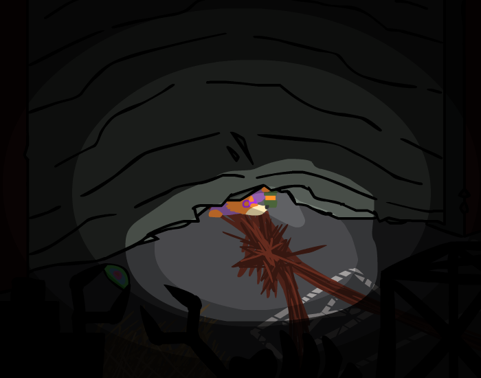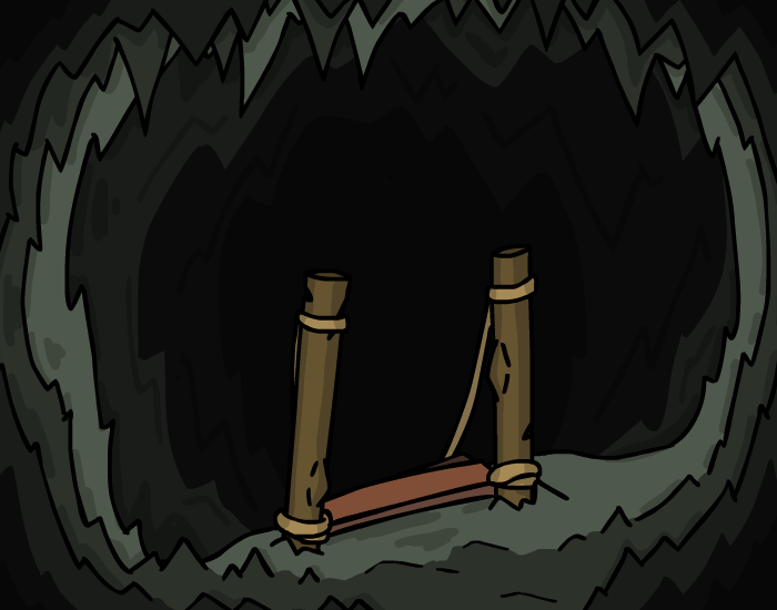 You kick something hidden in the mist, and the loud sound of metal rattling echoes through the cave, waking up anything that might have been sleeping for miles. Looking around in a panic, you still can’t see anything that’s moving in the shadows, with the exception of the great stone door slowly closing again behind you. You’d be more horrified if it wasn’t for the reason that you know you can’t go back that way anyway. Bending down, you search around your feet, finding an odd stone platform and… manacles on the end of a short chain? Has someone been held captive in here?