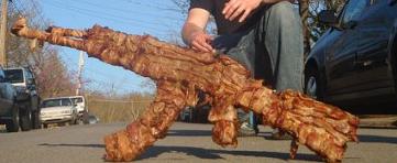Calling out to the bacon lying around you, you formed yourself into the shape of a weapon. A Russican made AK-47. You shot bullets of fat globules at the man, and the fat globule went so fast that they started burning. When they touch the man, the man errupted in flames and died an agonizing death.