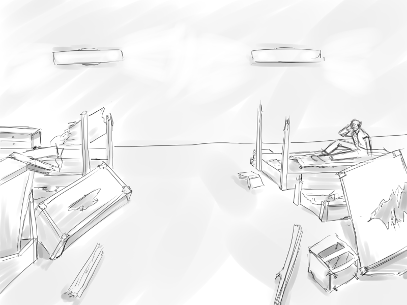The room is in complete disrepair. There are damaged beds, most of them broken in half, layered about the room. There's a mirror in a far off corner of the room, Dimitri decides to take the time to clean up a bit. Other than the damaged beds, there seems to be a collection of random books placed neatly next to the bed Dimitri was sleeping on. To the side of the room, a small cabinet is positioned neatly away from all the damaged beds.