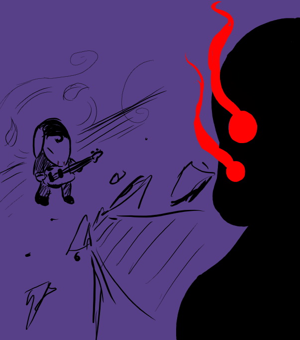 Emobold changes class to BARD. FIGHTER lacks proficiency in COMBAT: MUSIC. FIGHTER used SING, but they are holding a WOODWIND! It's not very effective... Fighter is WEAKENED by DISSONANT CROONING! EmoBARD ROCKS OUT! It's SUPER EFFECTIVE! FIGHTER starts FEELING STRANGE. EmoBARD gains POWER from MUSICAL ACCOMPANIMENT.