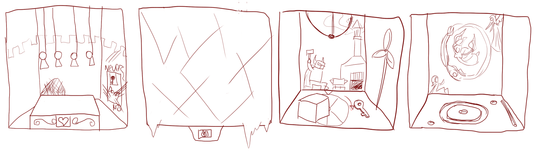 Use the key in the keyhole on the leftmost scene, then leap away back to avoid the consequences.