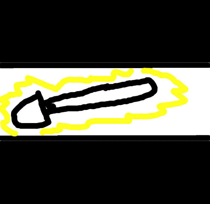 I tie the STRING around the SHOVEL HEAD and the WOODEN STICK, to make a FEEBLE SHOVEL! It's so poorly made it will only resist digging one and only one hole, so I must be careful. If the string snaps, I can't put it back around both pieces.