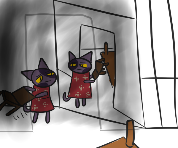 Because we've all seen the show with the walrus and that bald guy, Bob decides its best not to spend time peeing on cherished clothing. Leaving without saying much else, Bob takes the chair to the mirror. IN MORE WAYS THAN ONE. Two. Two ways.